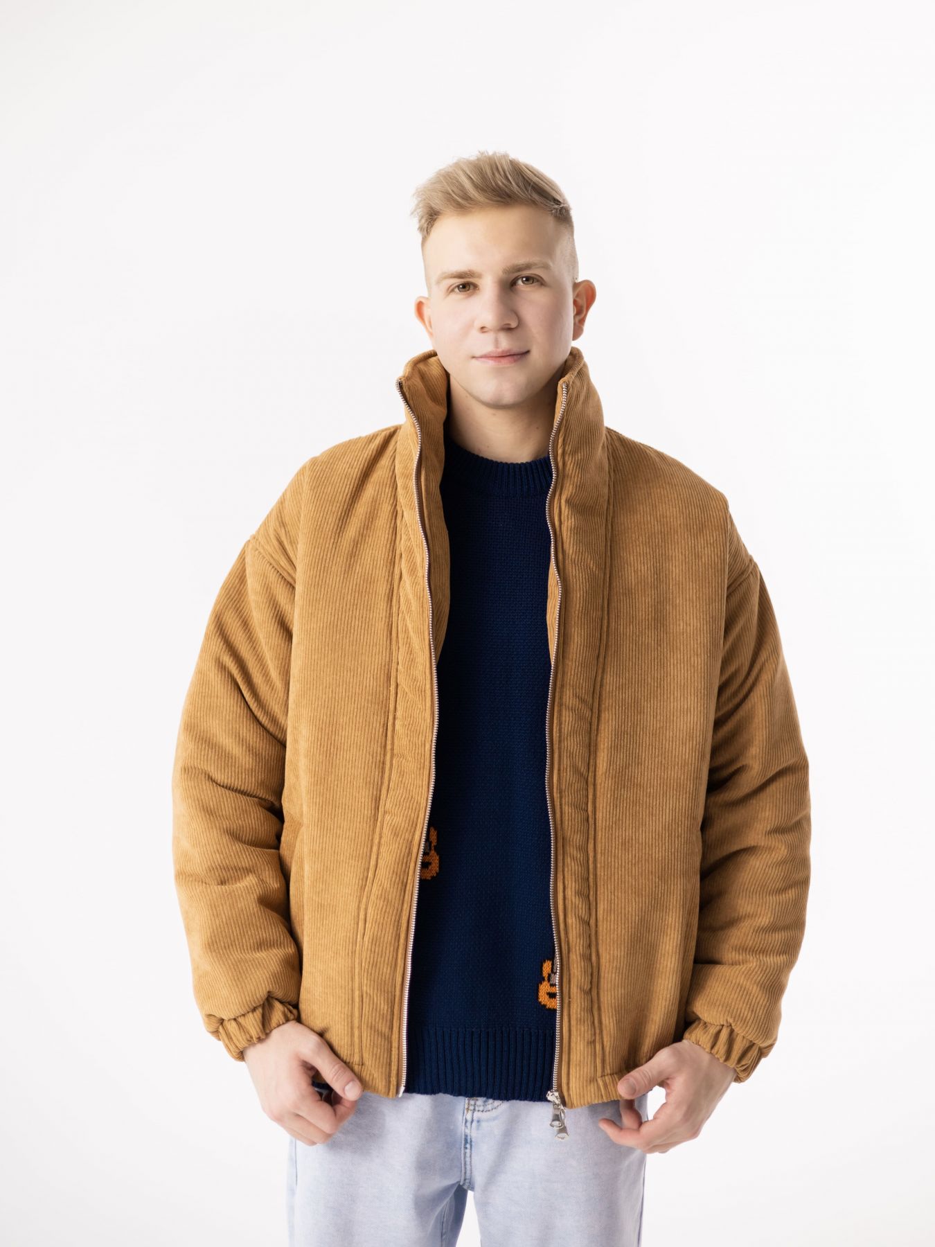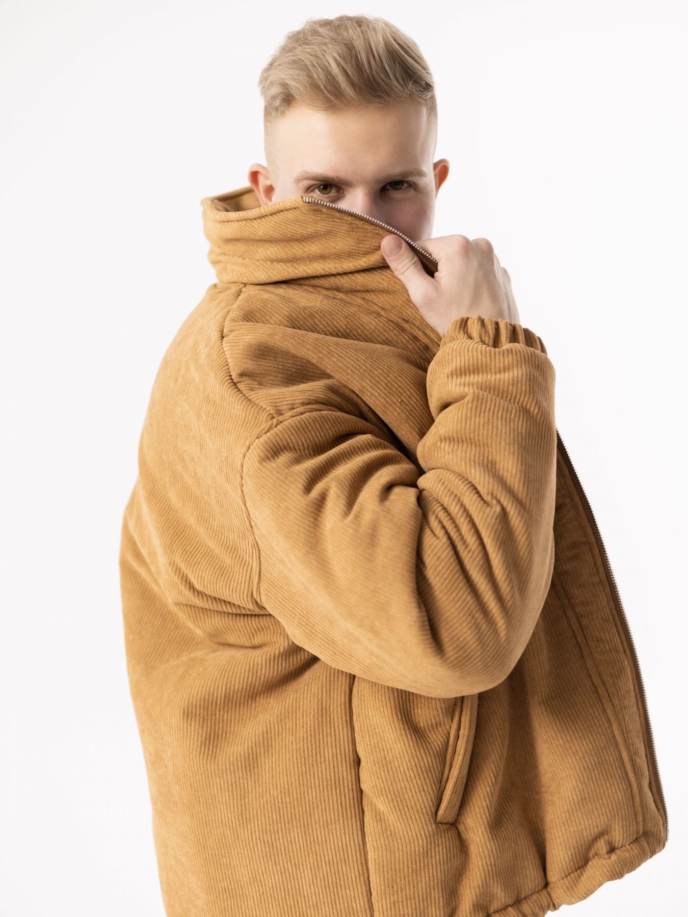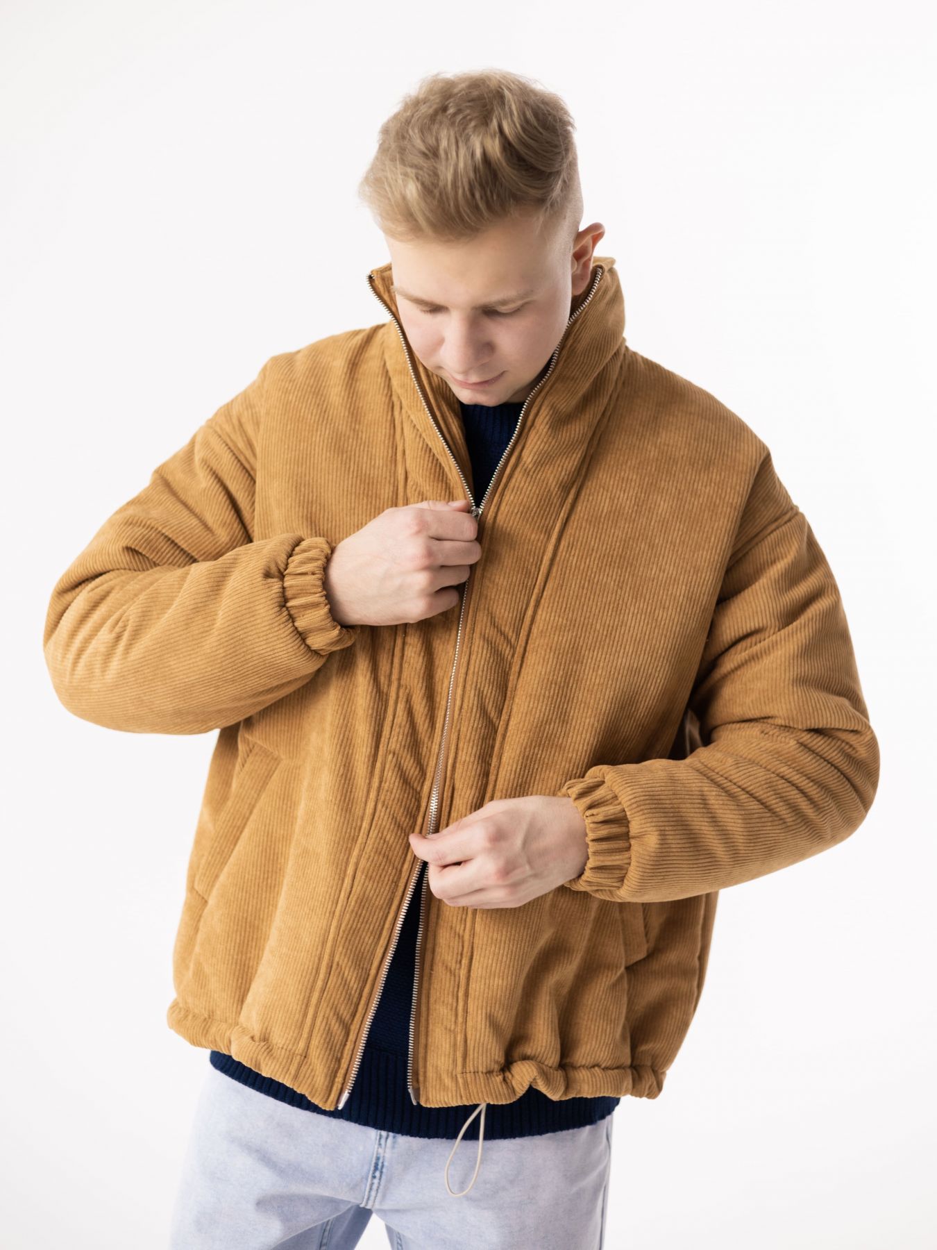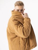Куртка зимняя сшита из итальянского вельвета в цвете охра. Двойная молния, регулируемый низ, карманы. Легкий и теплый бомбер с утеплителем Сиберия до -20°С.
