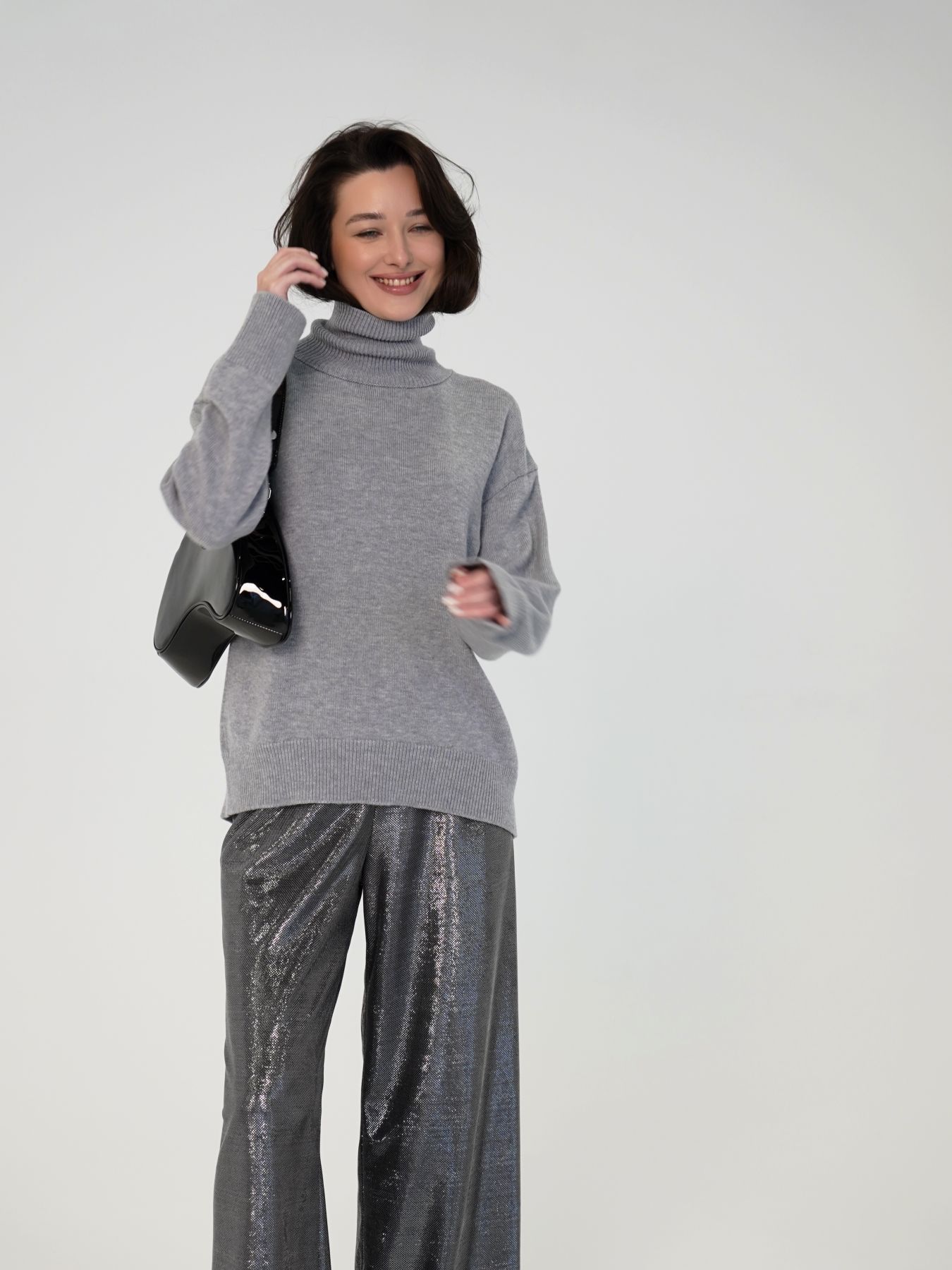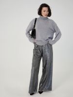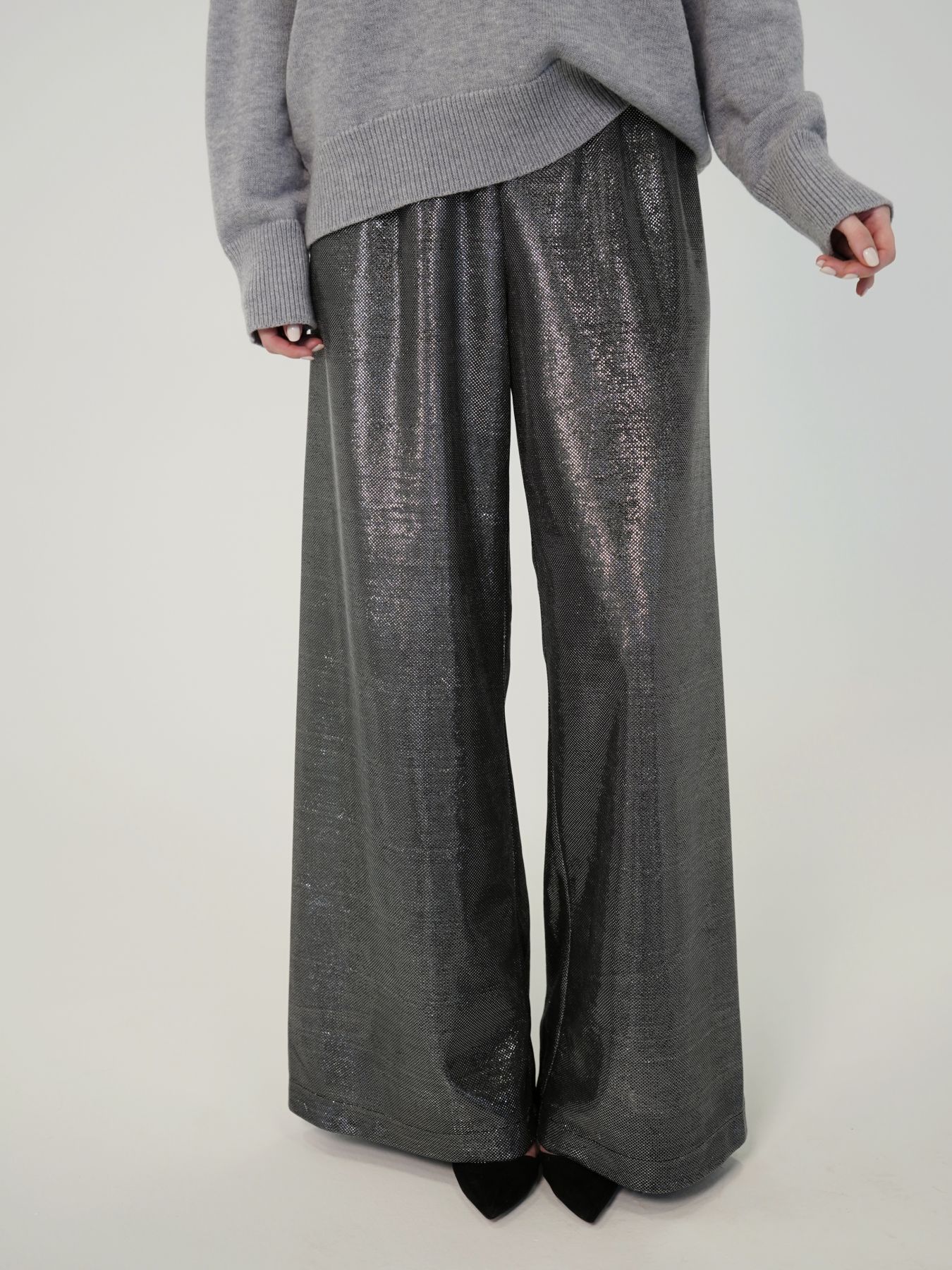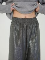 Брюки бесшовные с высокой талией на резинке, свободного кроя из блестящего трикотажа.