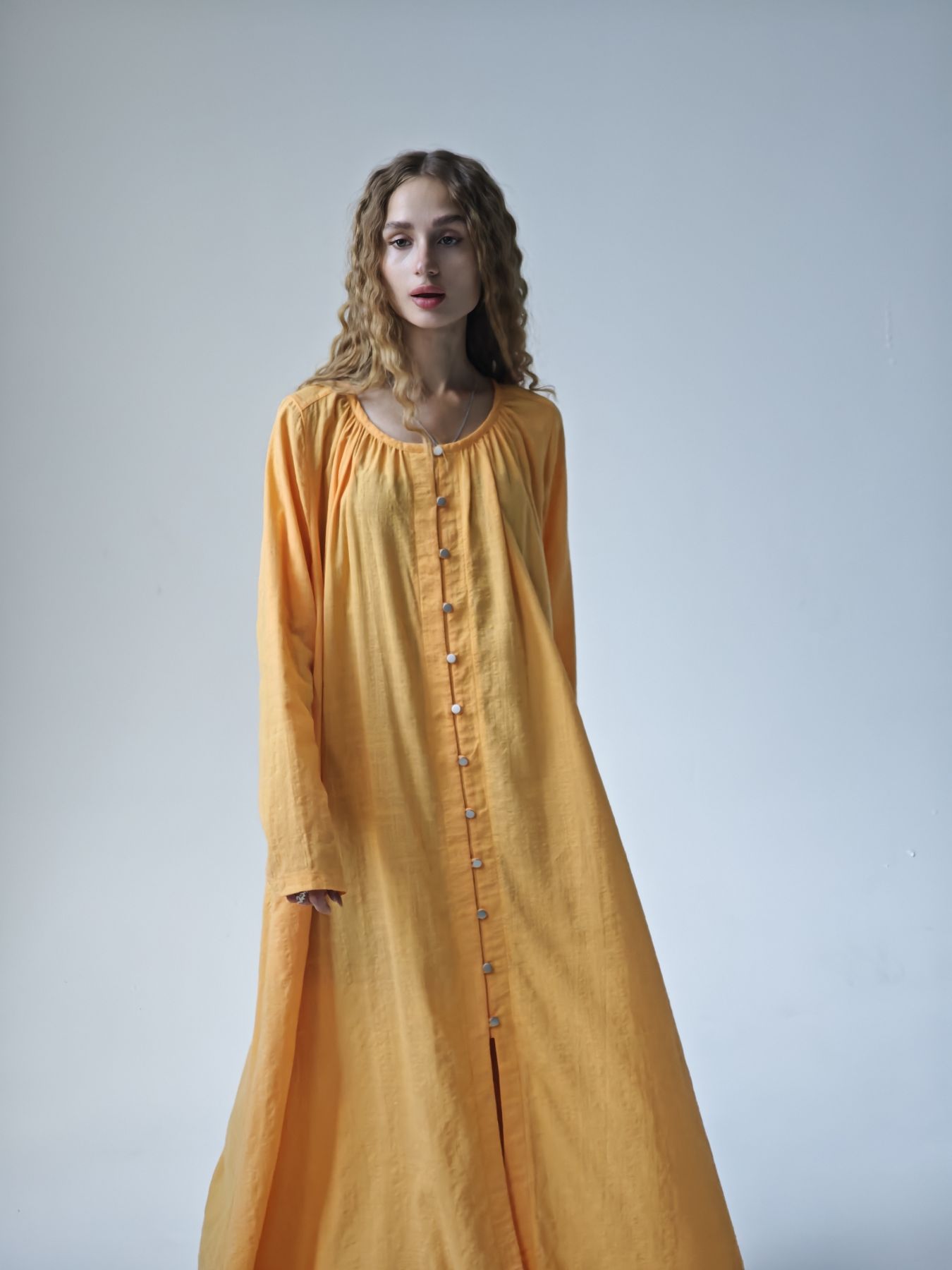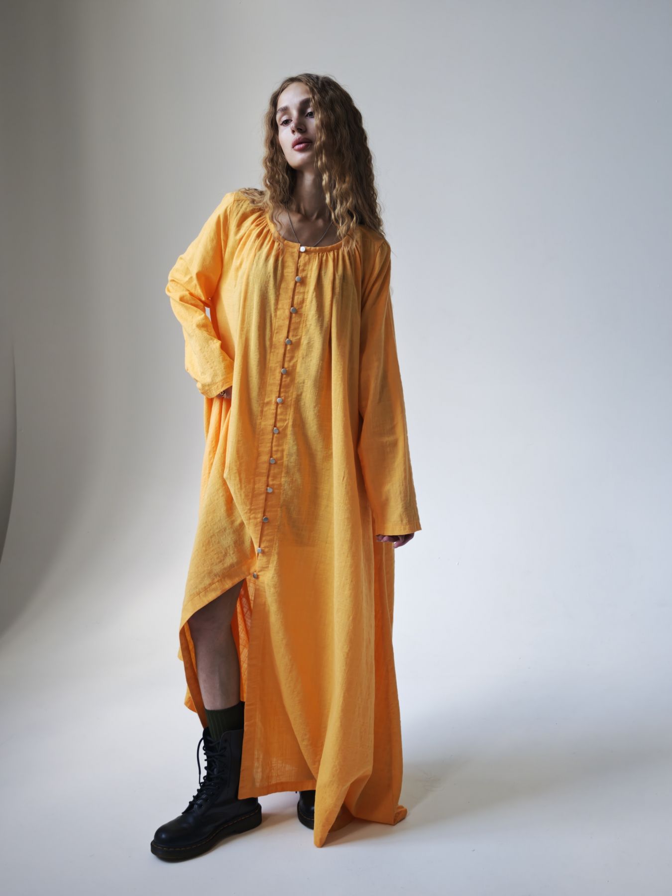 Платье женское оранжевого цвета из натурального хлопка с вискозой оверсайз кроя на пуговицах. Можно носить как самостоятельное платье, либо в качестве накидки. Идеально на лето - днем не жарко, а вечером защищает от ветра.