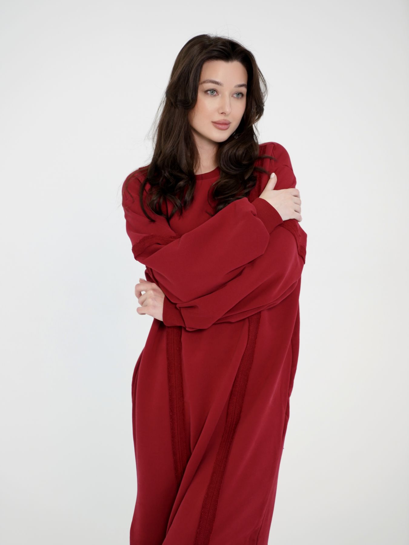 Плотное и очень мягкое платье из футера 3х нитки, бордового цвета. Объемное платье миди с разрезом. Спереди выполнена отделка в виде швов, что украшает и вытягивает женский силуэт. Объемные рукава с защипами.