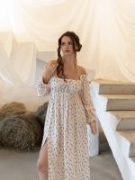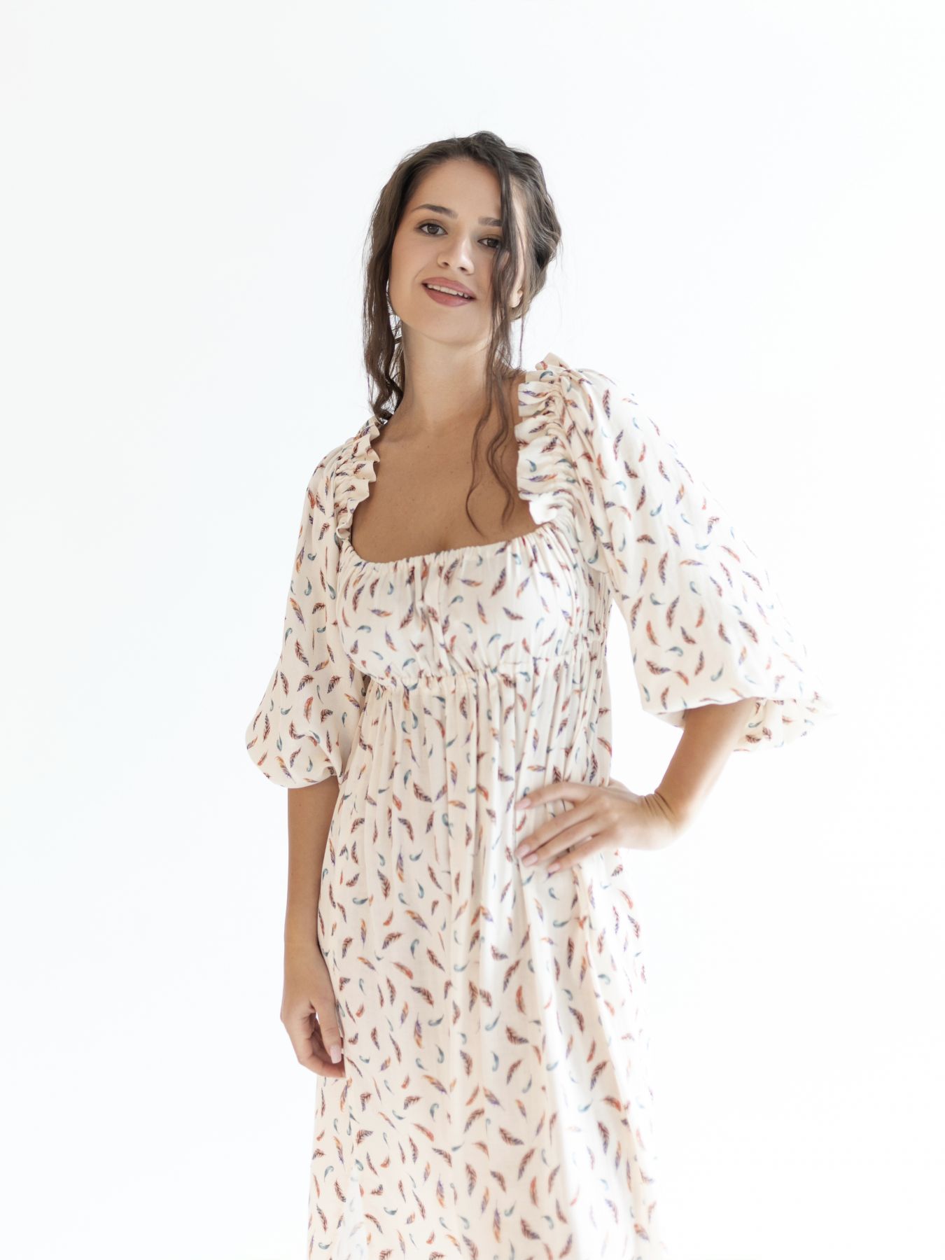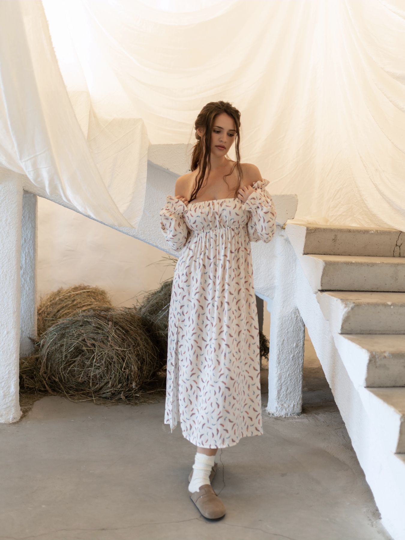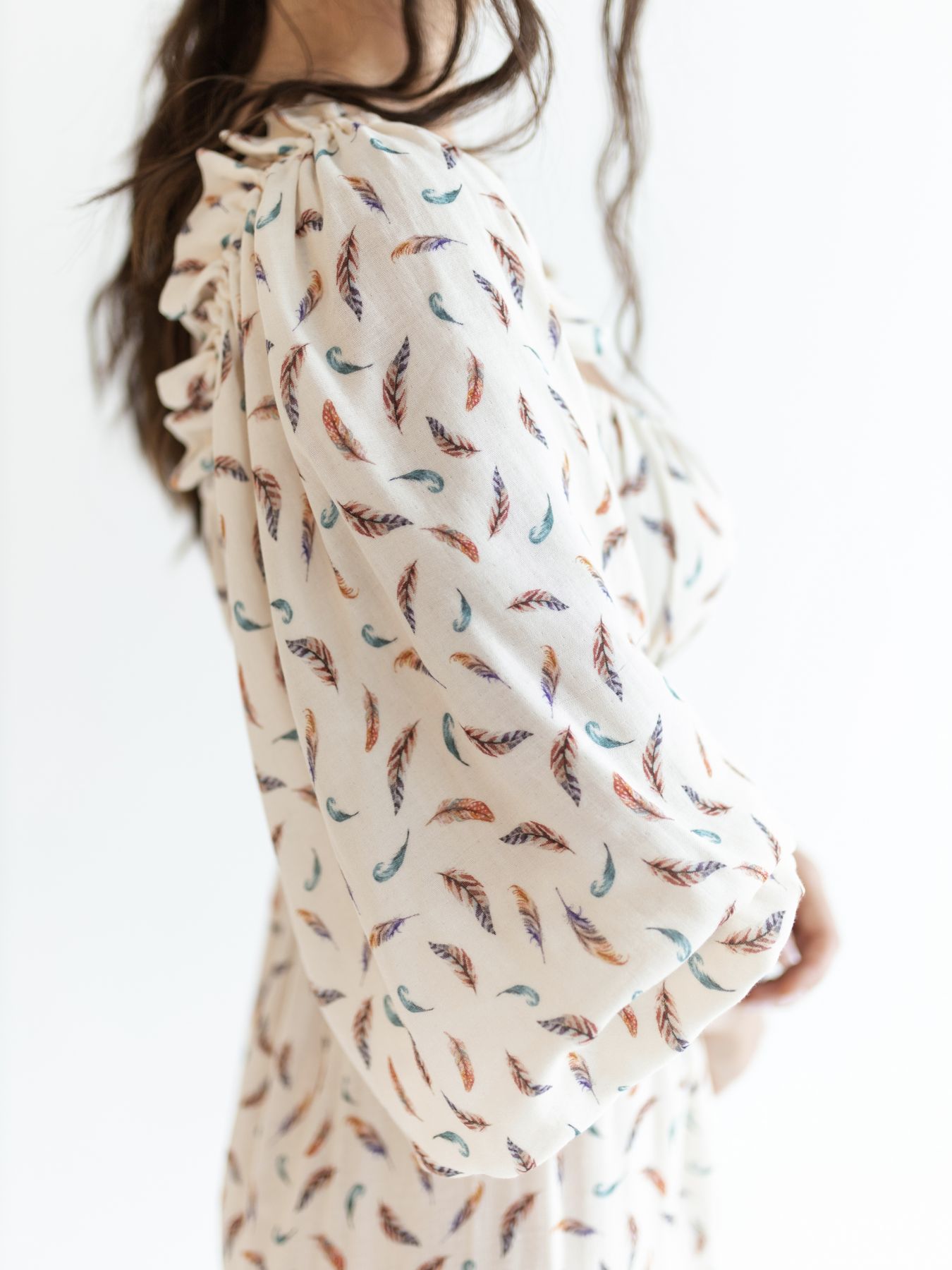 Бежевое платье миди с разрезом и пышными объемными рукавами. Из легкого муслина, бамбук 100%. Легкое платье свободного кроя, украшено нежным принтом "Перья". Можно носить с открытыми или закрытыми плечами.