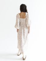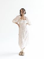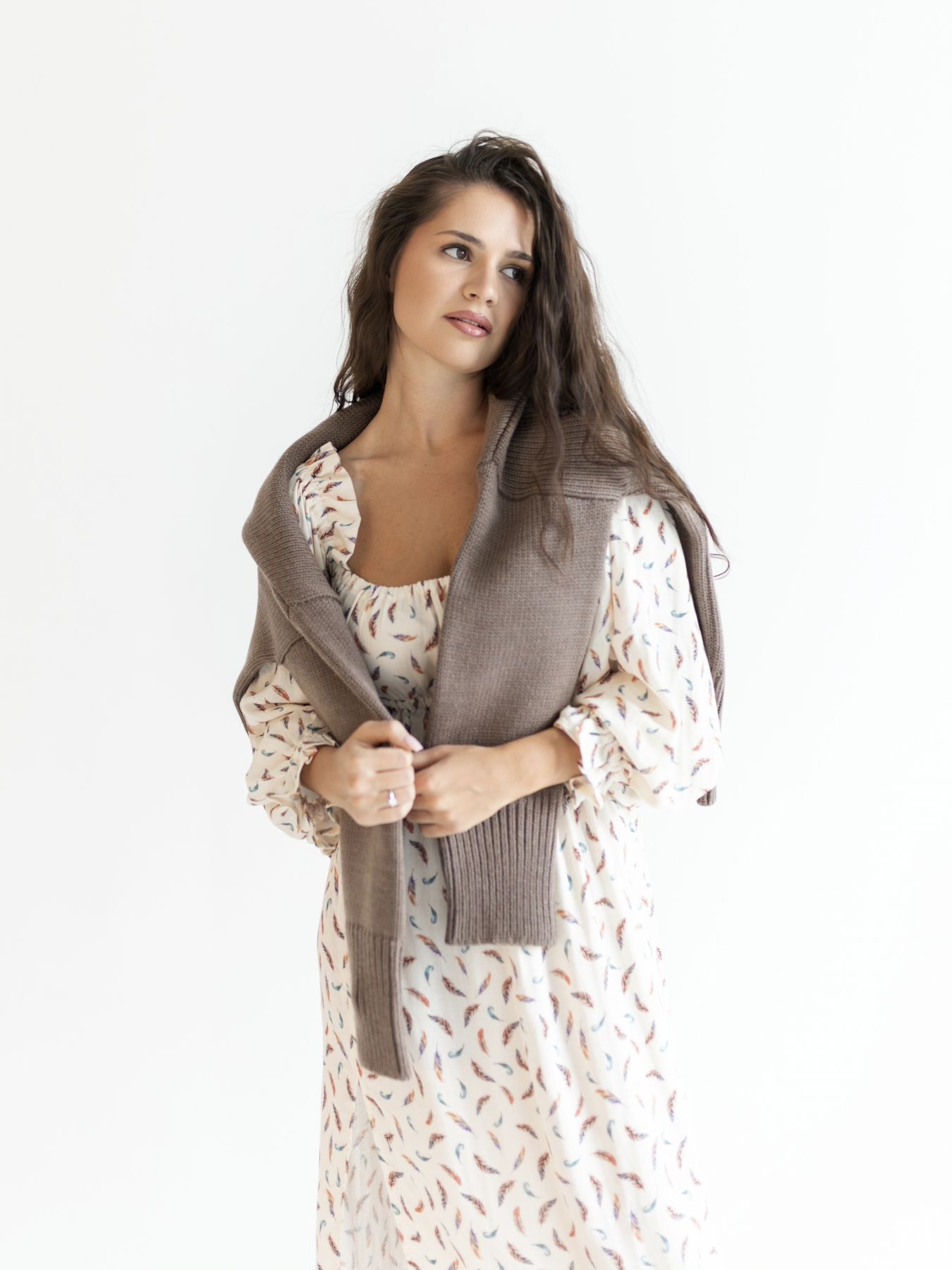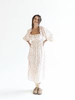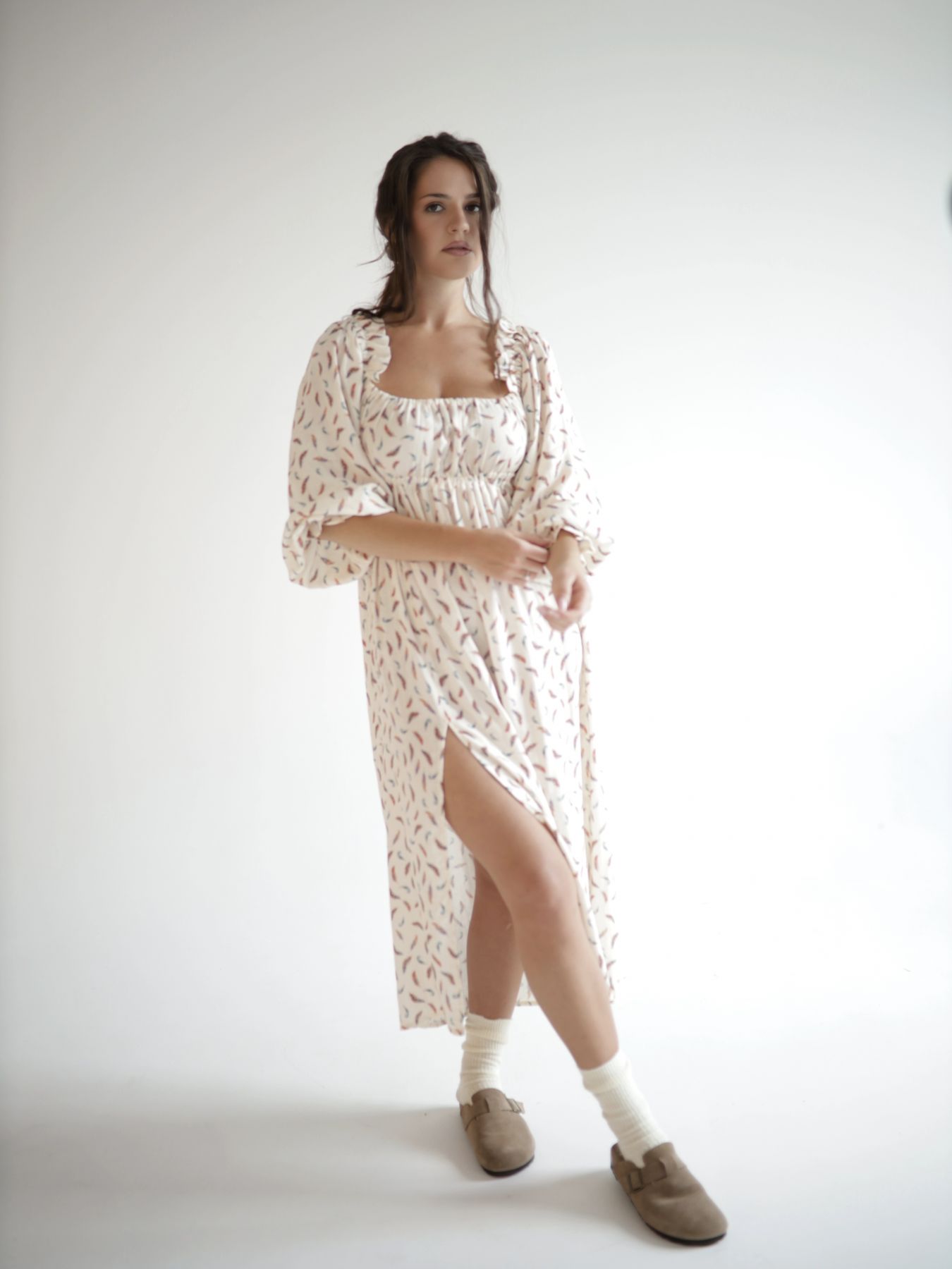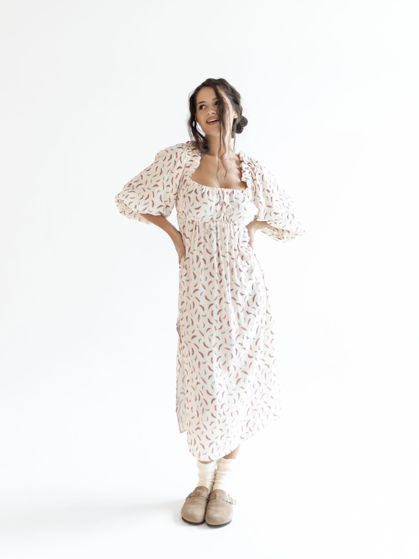 Бежевое платье миди с разрезом и пышными объемными рукавами. Из легкого муслина, бамбук 100%. Легкое платье свободного кроя, украшено нежным принтом "Перья". Можно носить с открытыми или закрытыми плечами.
