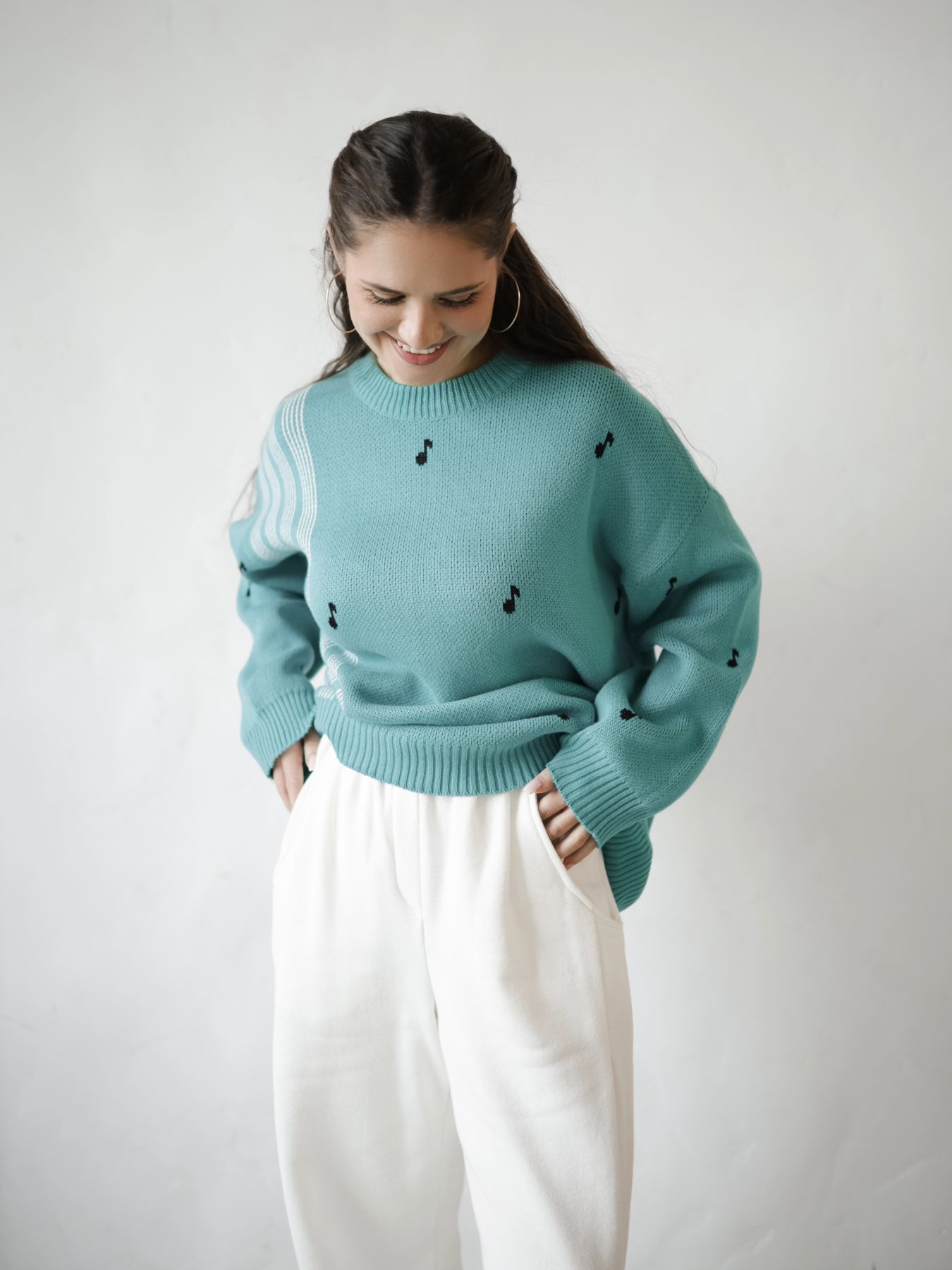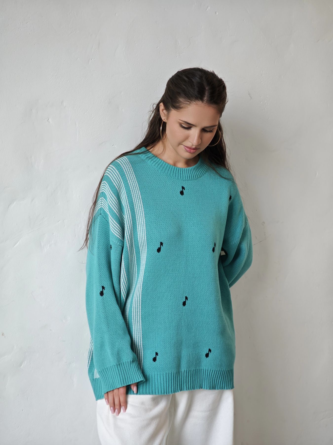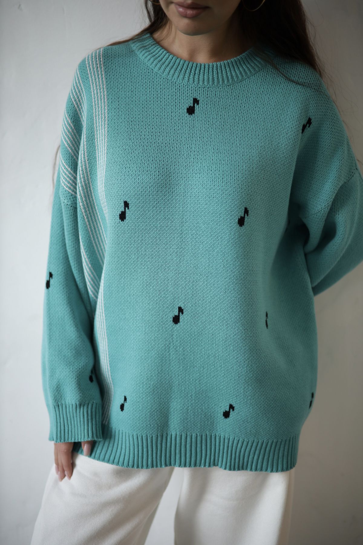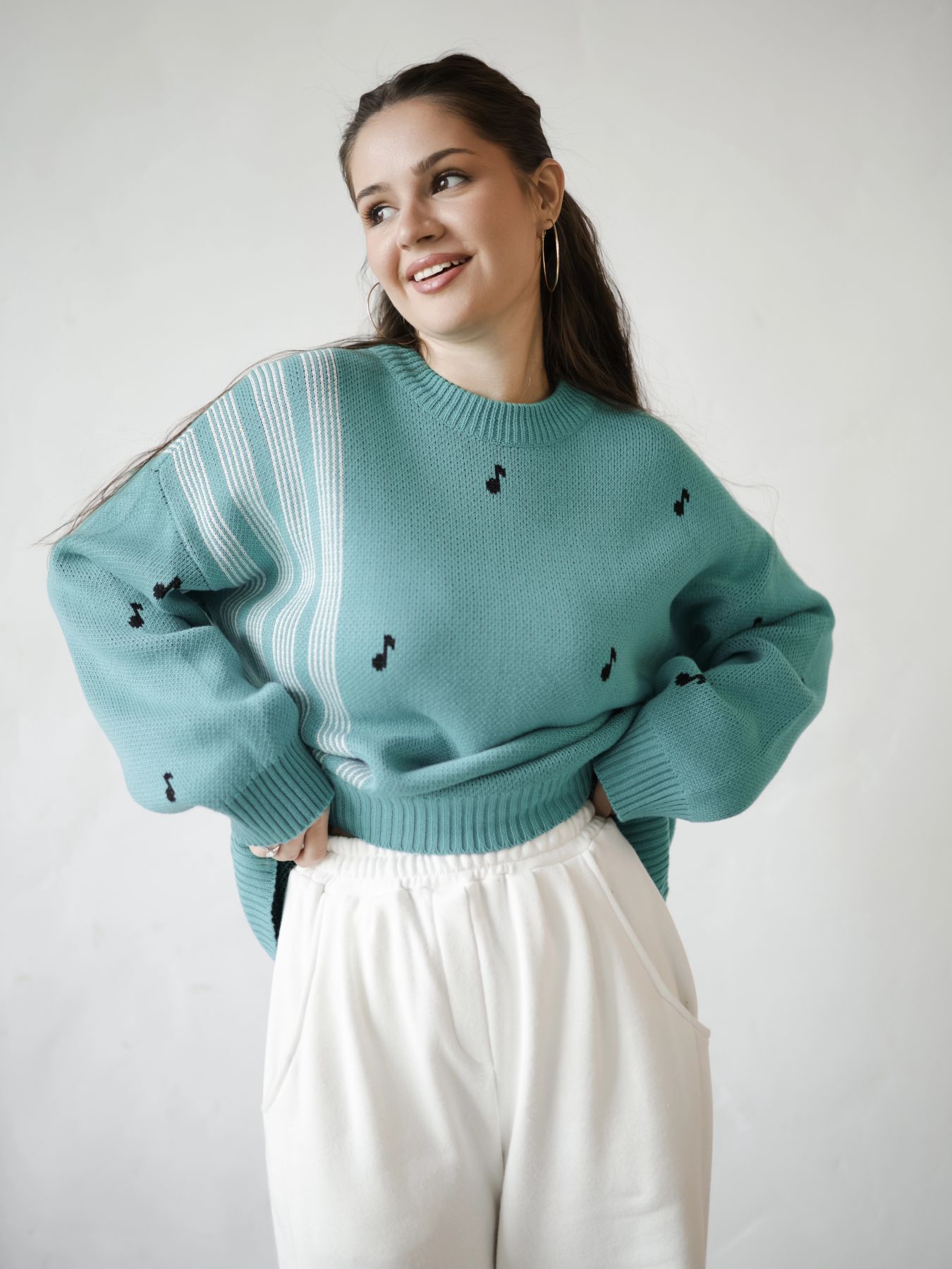 Авторский свитер бирюзового цвета из качественной пряжи (шерсть + хлопок) в едином размере с принтом "Ноты". Свитер мягкий и теплый, все принты разрабатываются нами в мастерской.