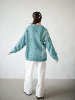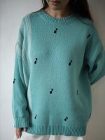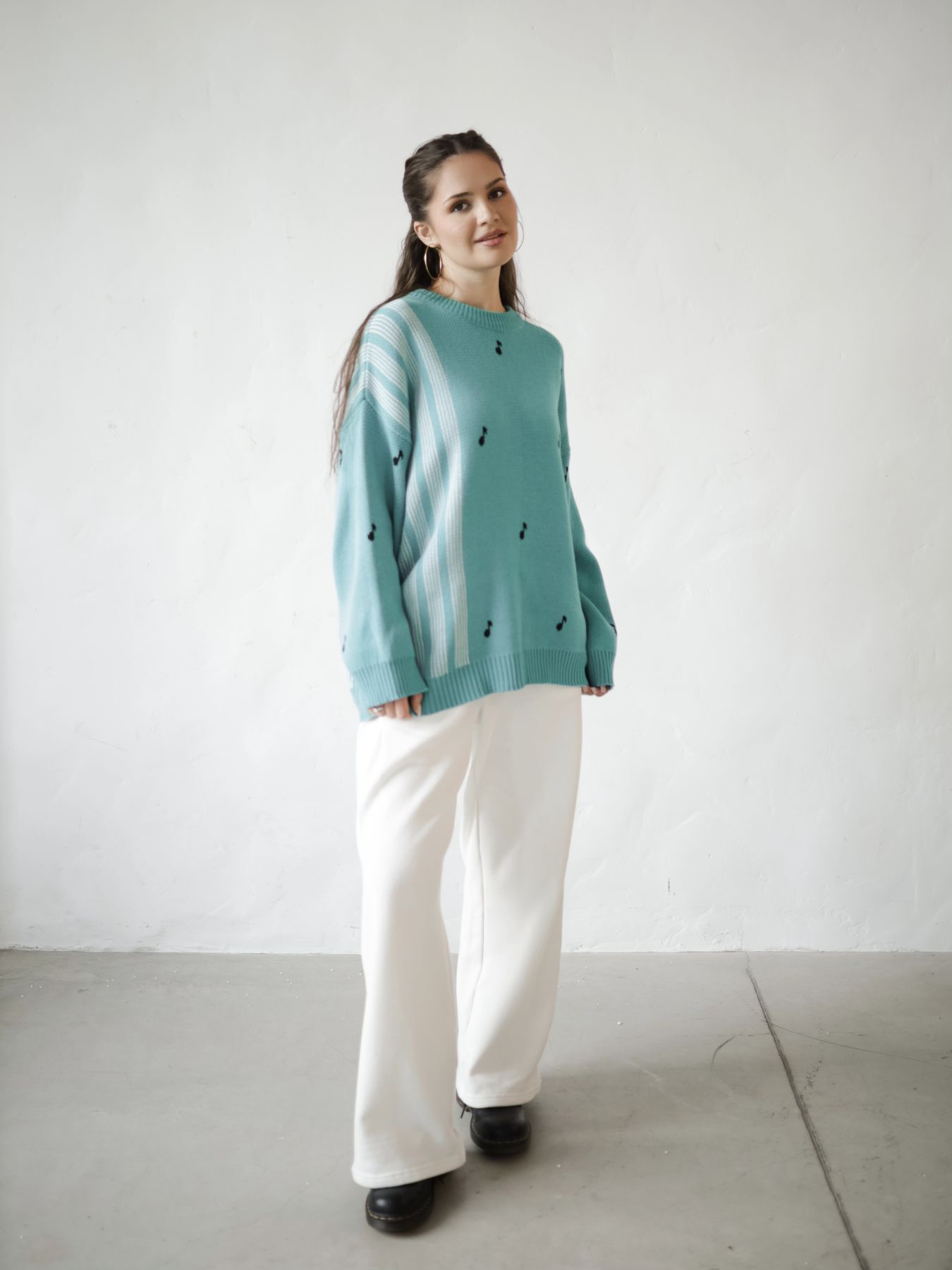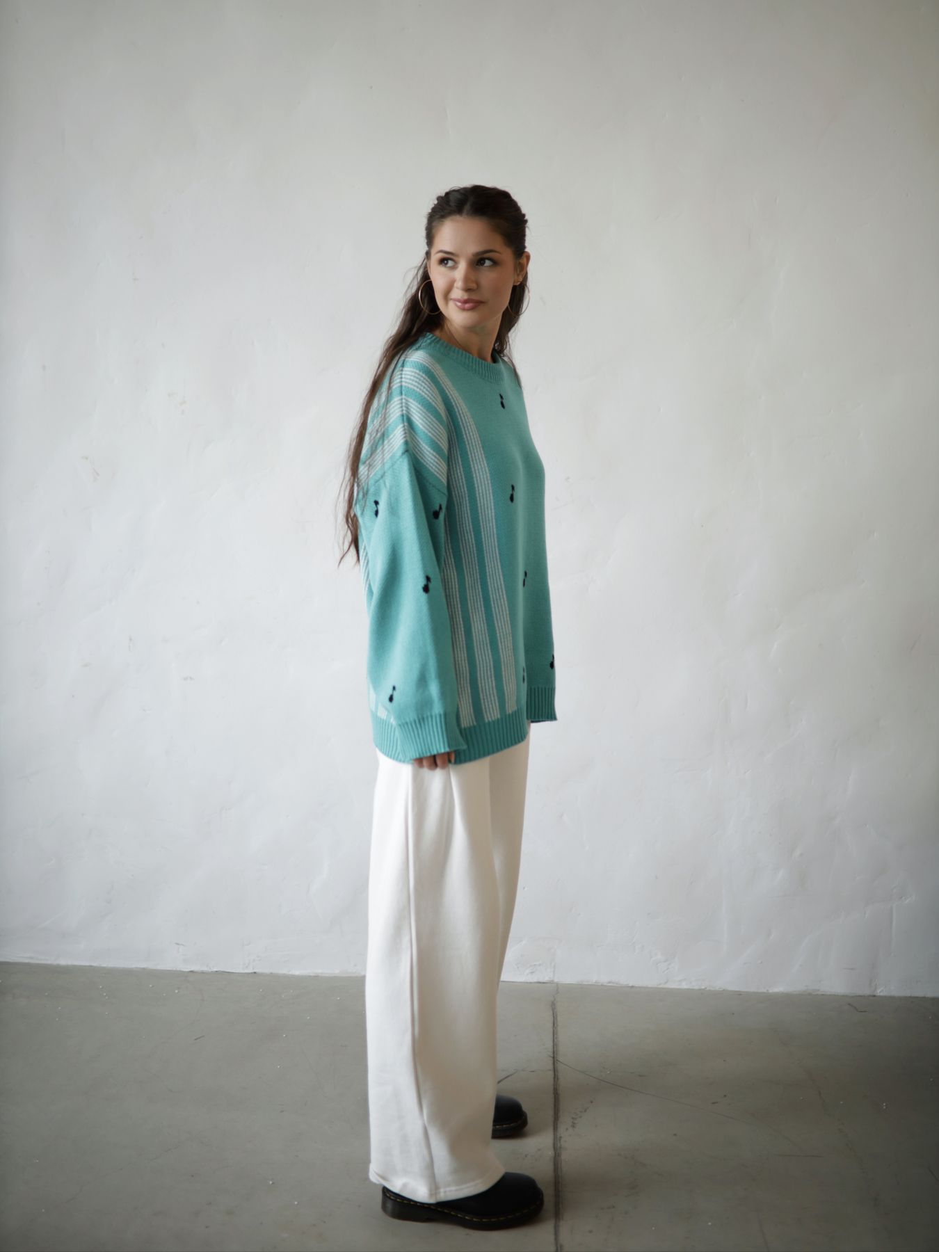 Авторский свитер бирюзового цвета из качественной пряжи (шерсть + хлопок) в едином размере с принтом "Ноты". Свитер мягкий и теплый, все принты разрабатываются нами в мастерской.