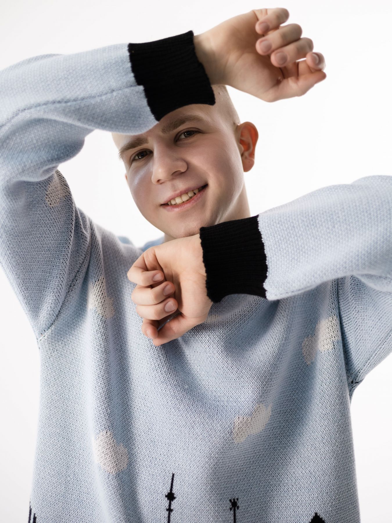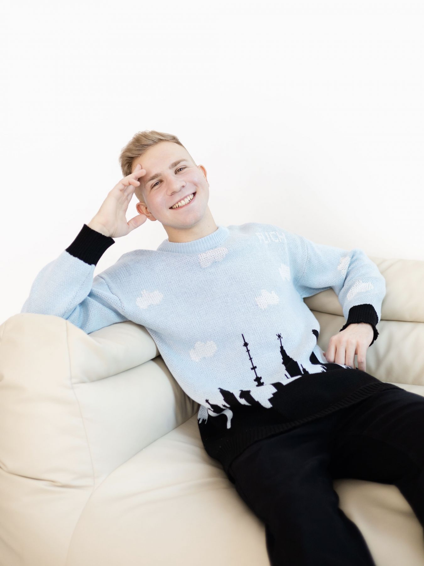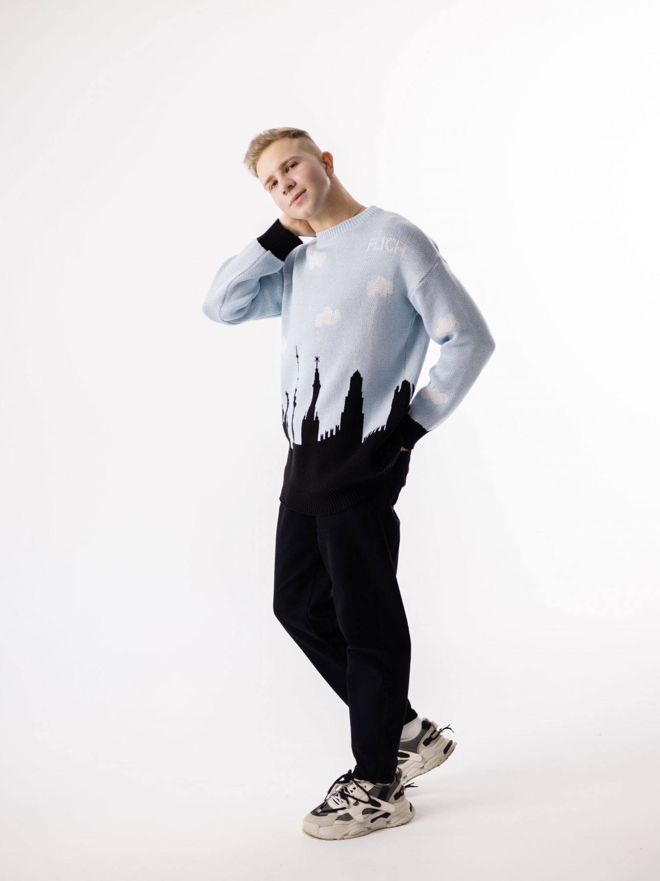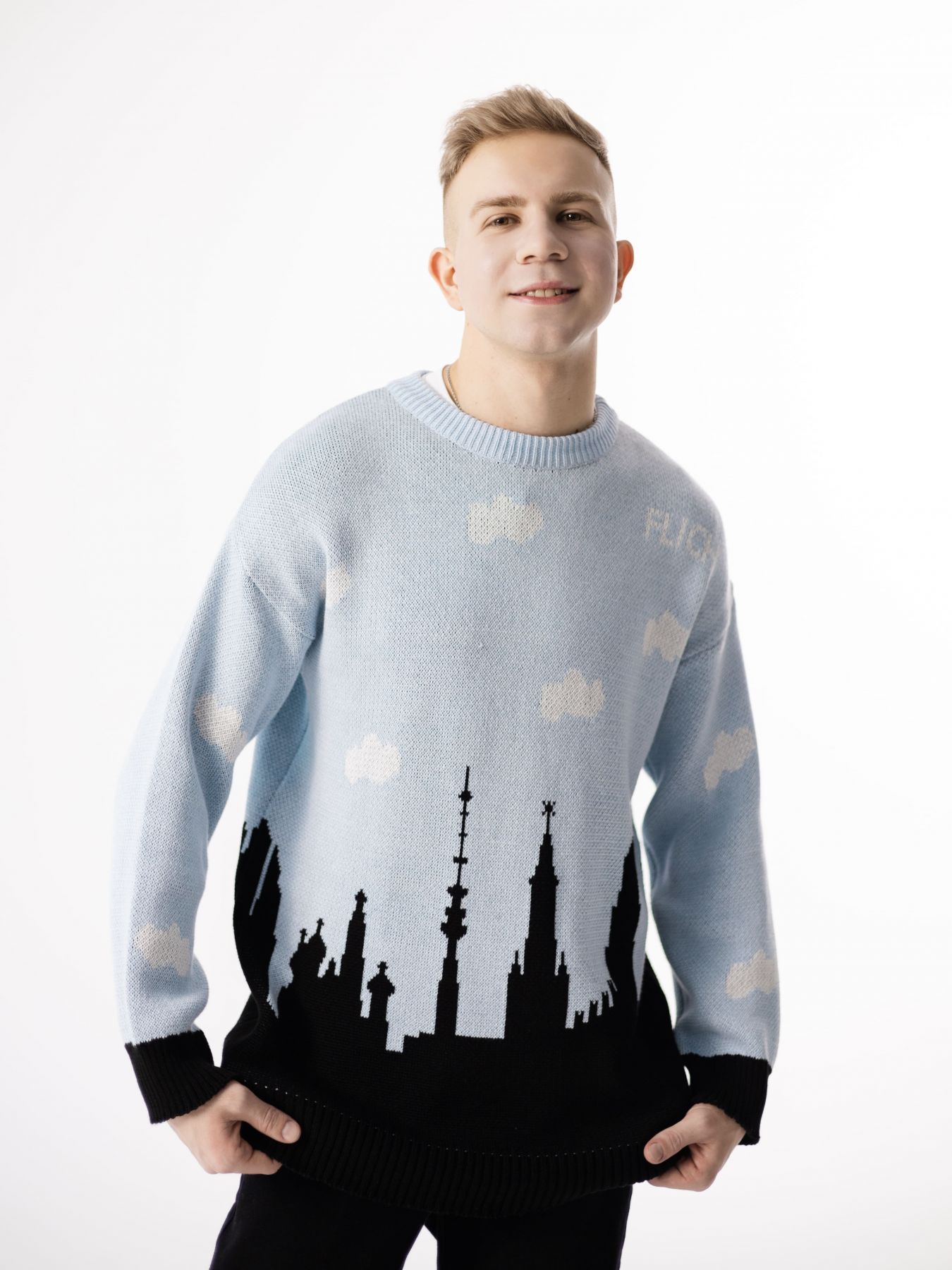 Дизайнерский голубой свитер из качественной пряжи (шерсть + хлопок) в едином размере. Свитер мягкий и теплый, все принты разрабатываются нами в мастерской. Этот принт воссоздает силуэт Москвы с его важными архитектурными строениями: Храм Василия Блаженного, Останкинская башня, Кремль, Москва-Сити. А так же впервые мы аккуратно нанесли логотип FLICH на обе стороны свитера так, что он гармонично дополняет чистое голубое небо над Москвой.