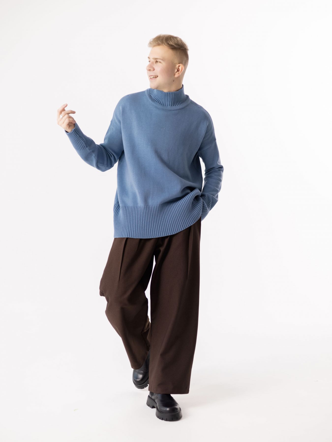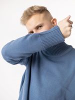 Шерстяной свитер однотонный джинсового цвета с воротником оверсайз кроя.