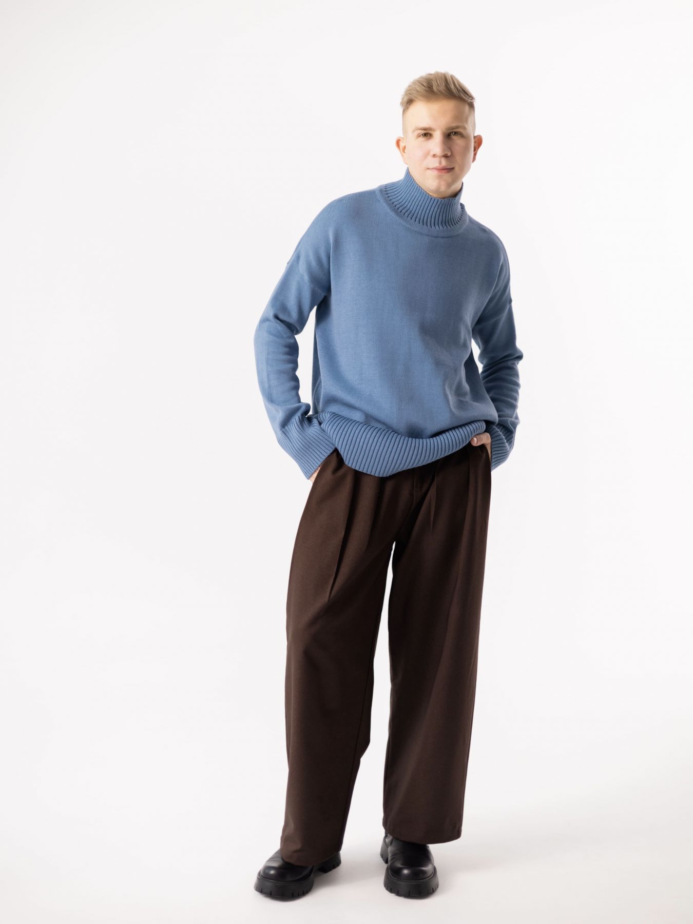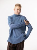Шерстяной свитер однотонный джинсового цвета с воротником оверсайз кроя.