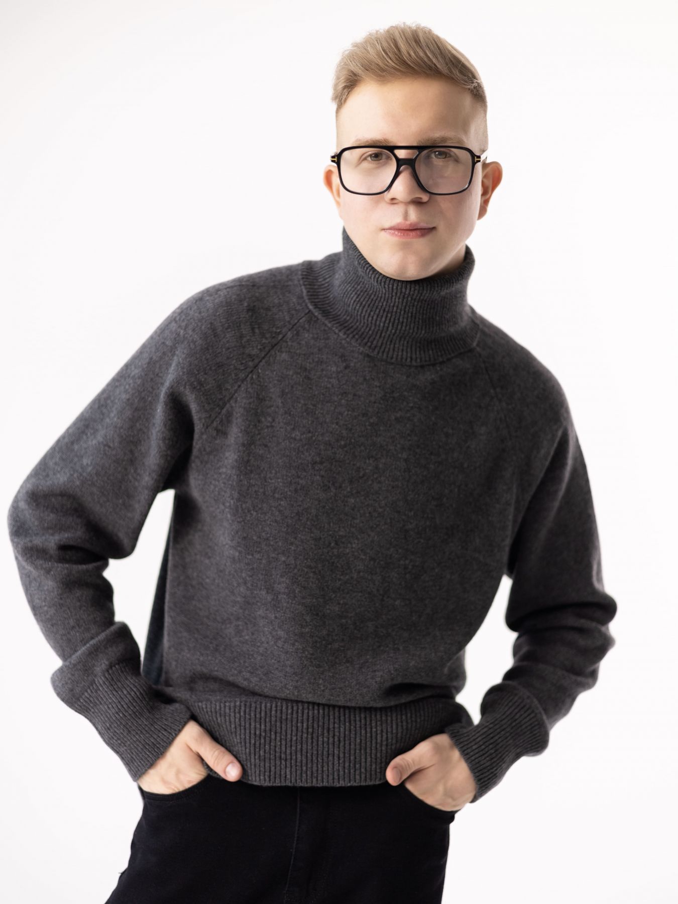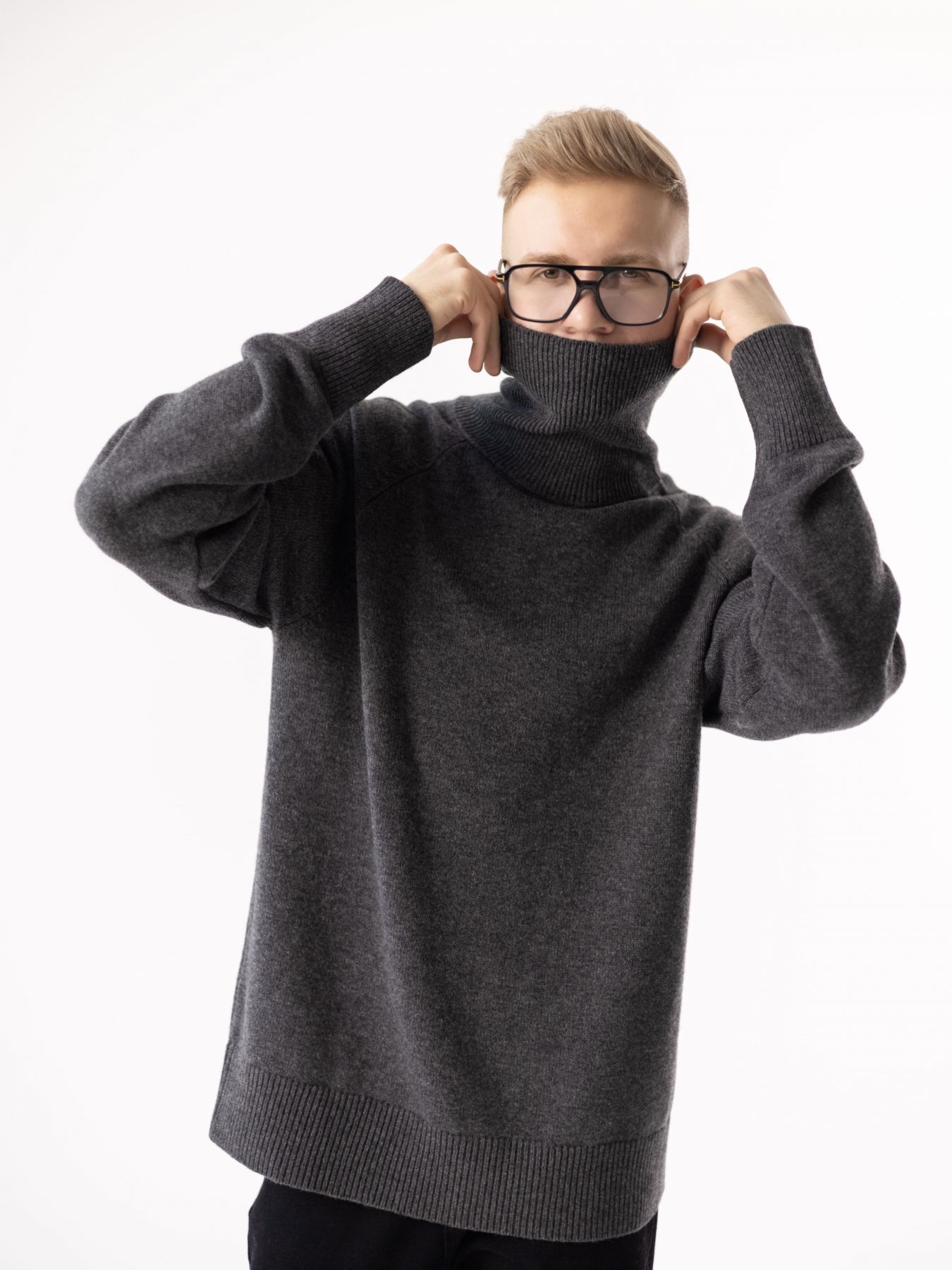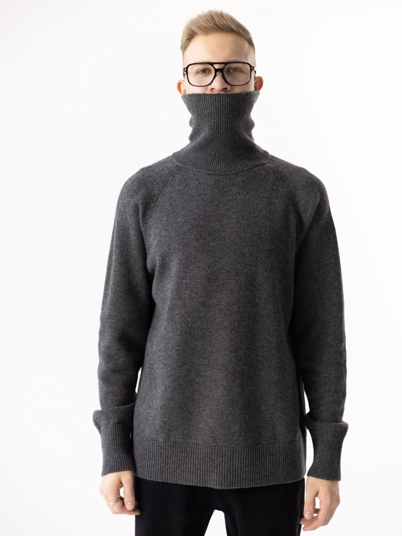 Шерстяной свитер однотонный темно-серого цвета оверсайз кроя с высокой стойкой.