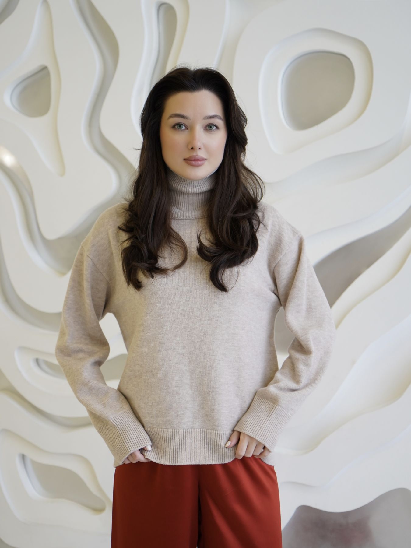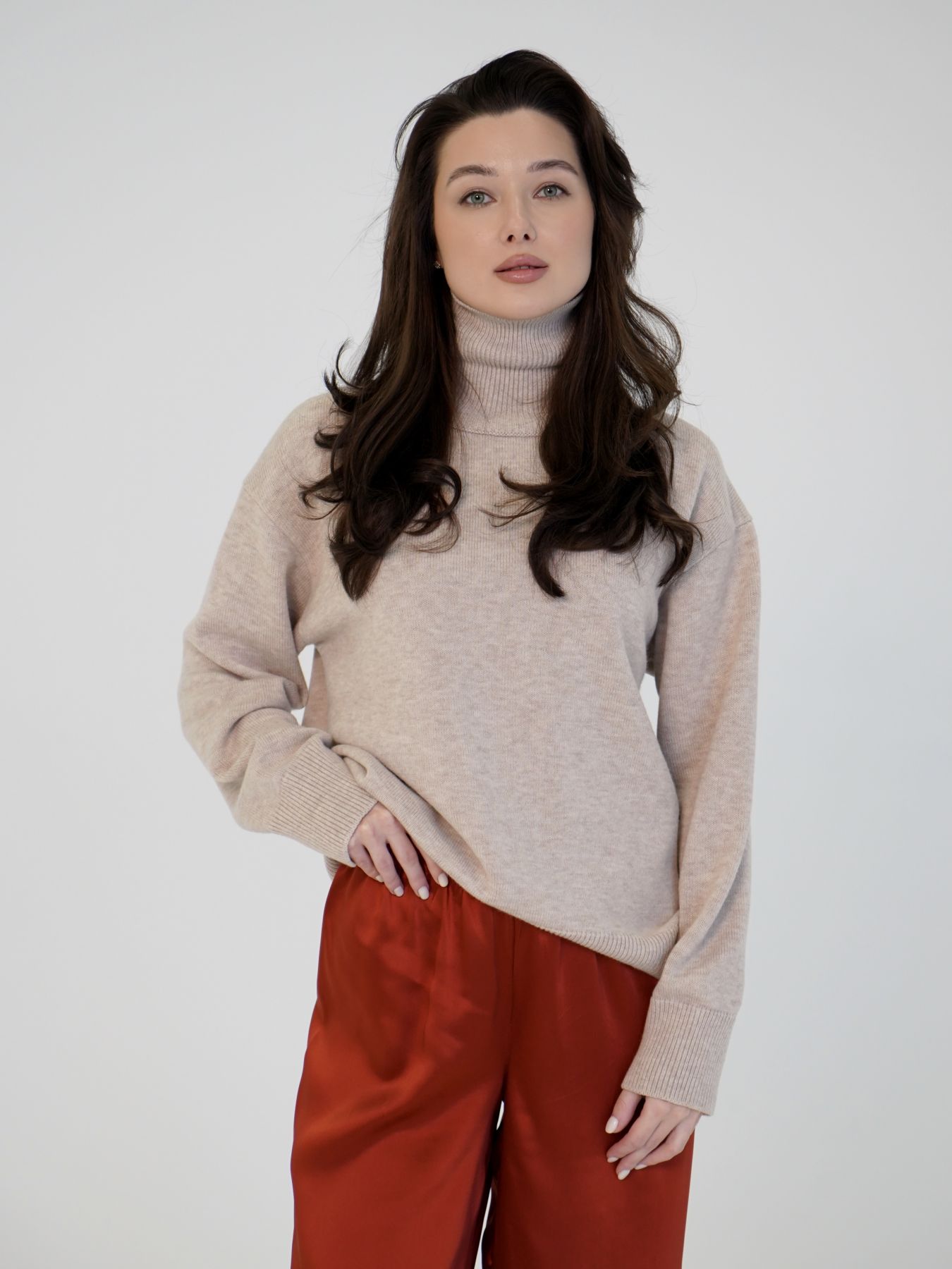 Шерстяной свитер однотонный бежевого цвета оверсайз кроя с высокой стойкой.