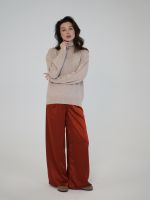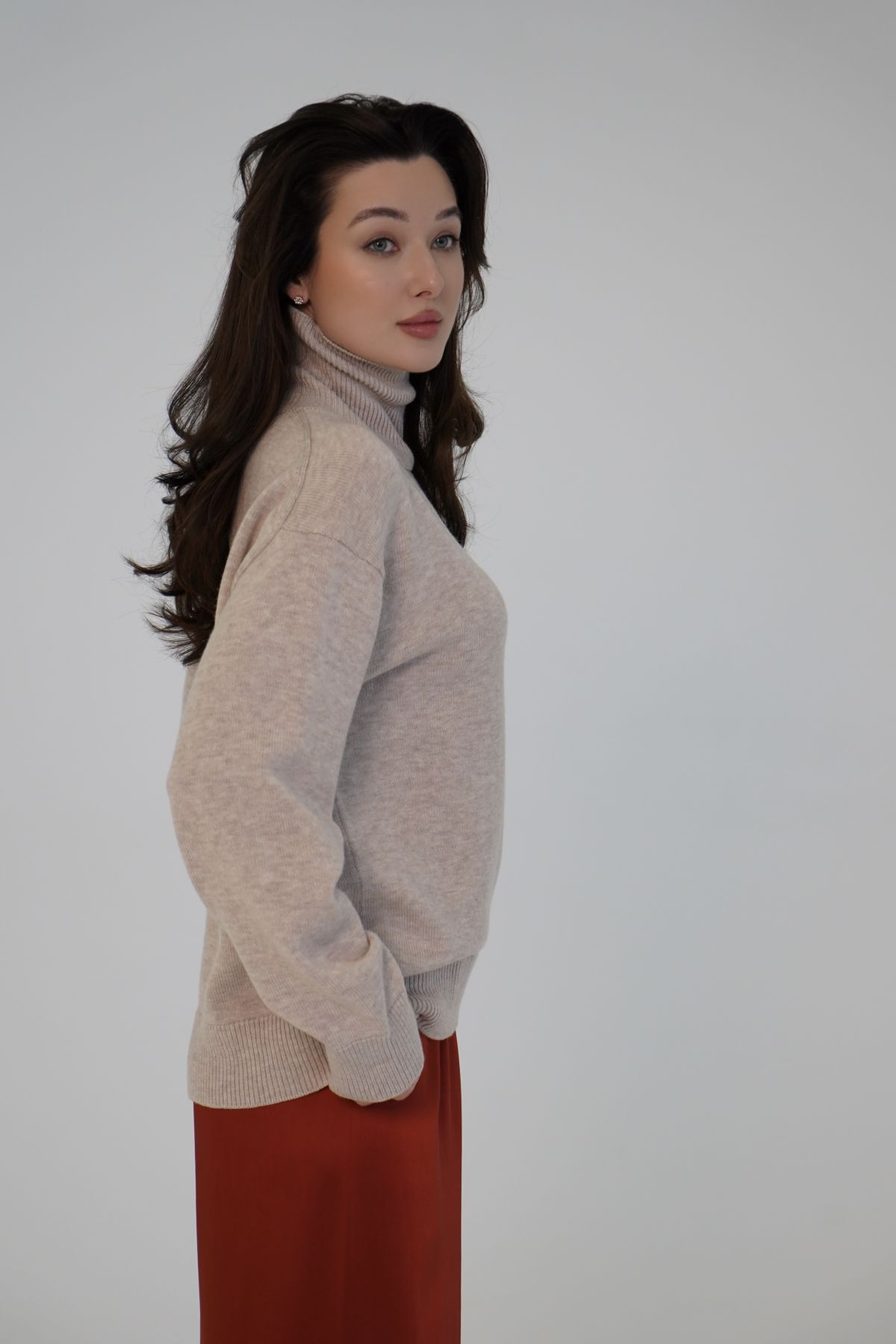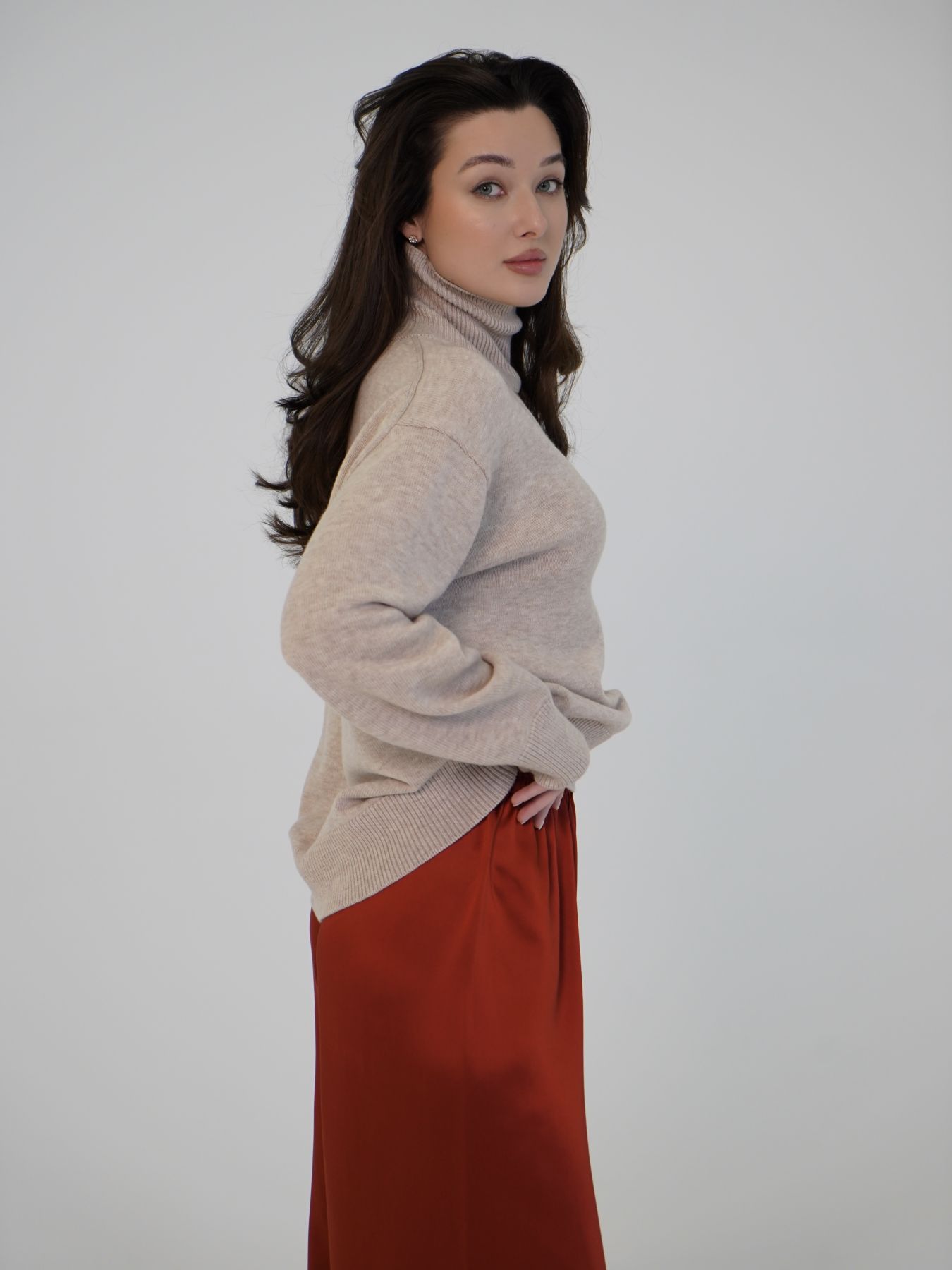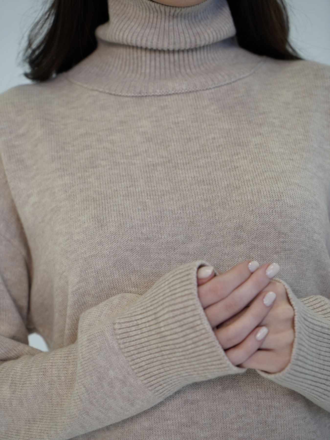 Шерстяной свитер однотонный бежевого цвета оверсайз кроя с высокой стойкой.