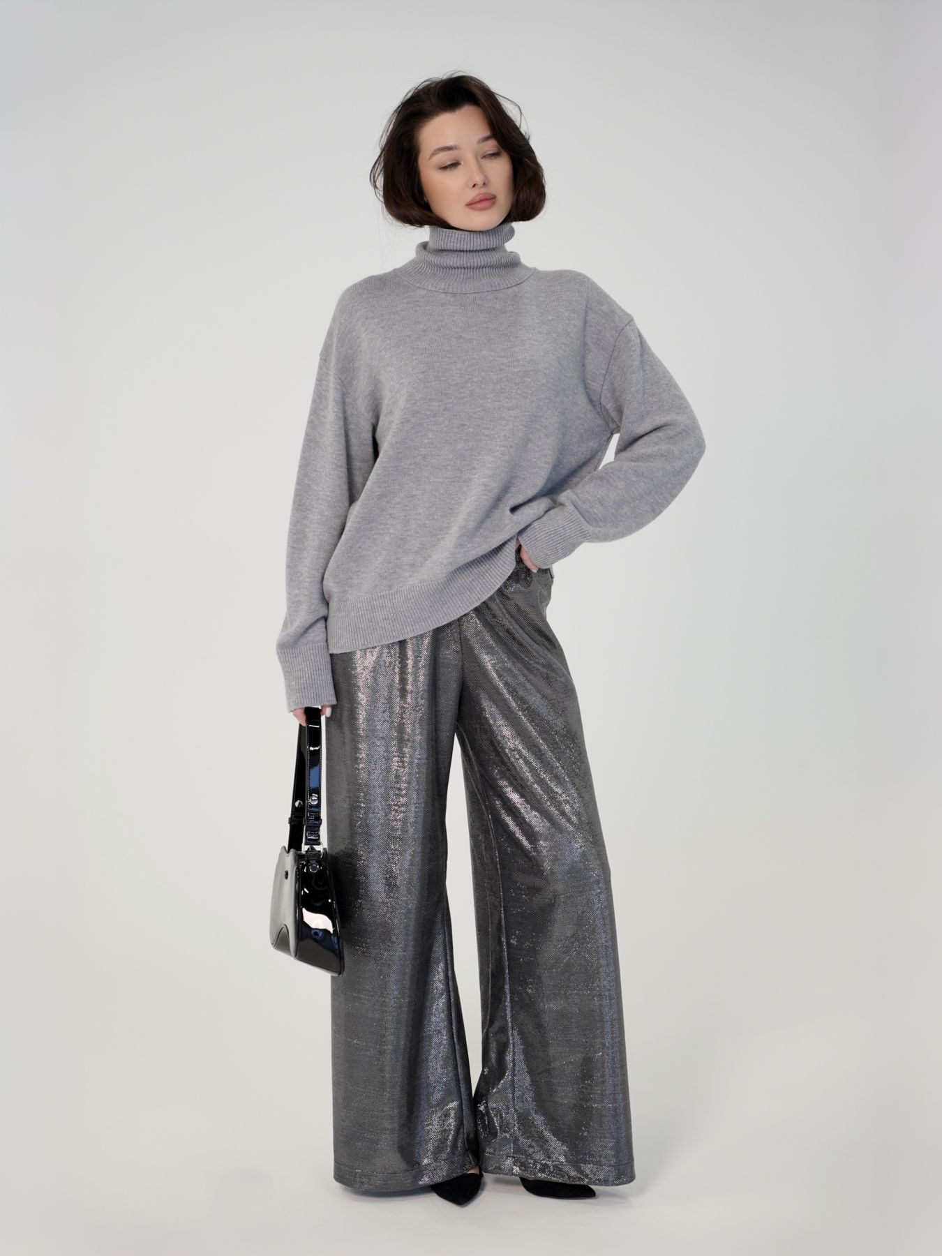 Шерстяной свитер однотонный светло-серого цвета оверсайз кроя с высокой стойкой.