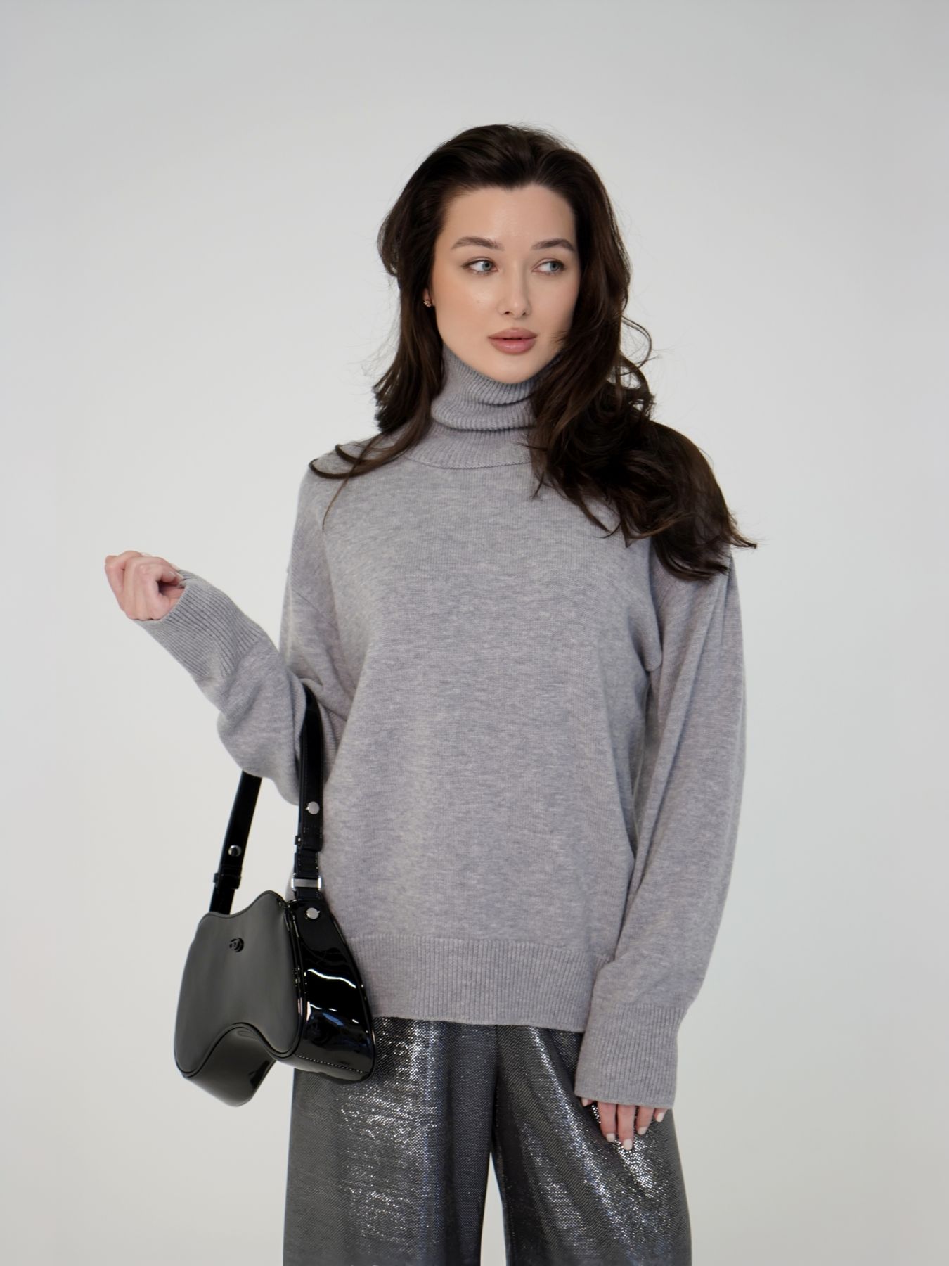 Шерстяной свитер однотонный светло-серого цвета оверсайз кроя с высокой стойкой.