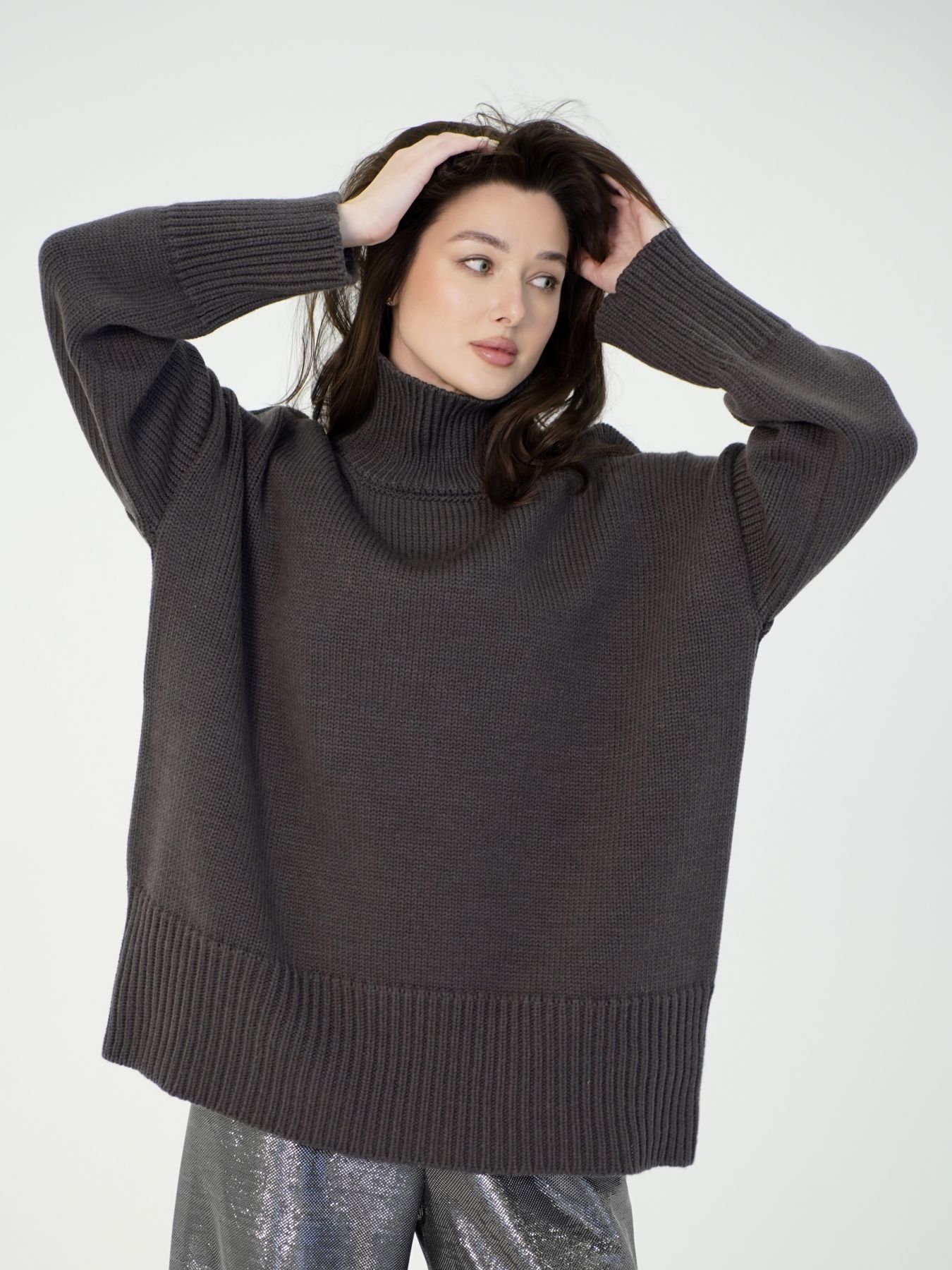 Шерстяной свитер однотонный серого цвета оверсайз кроя с широкой стойкой.