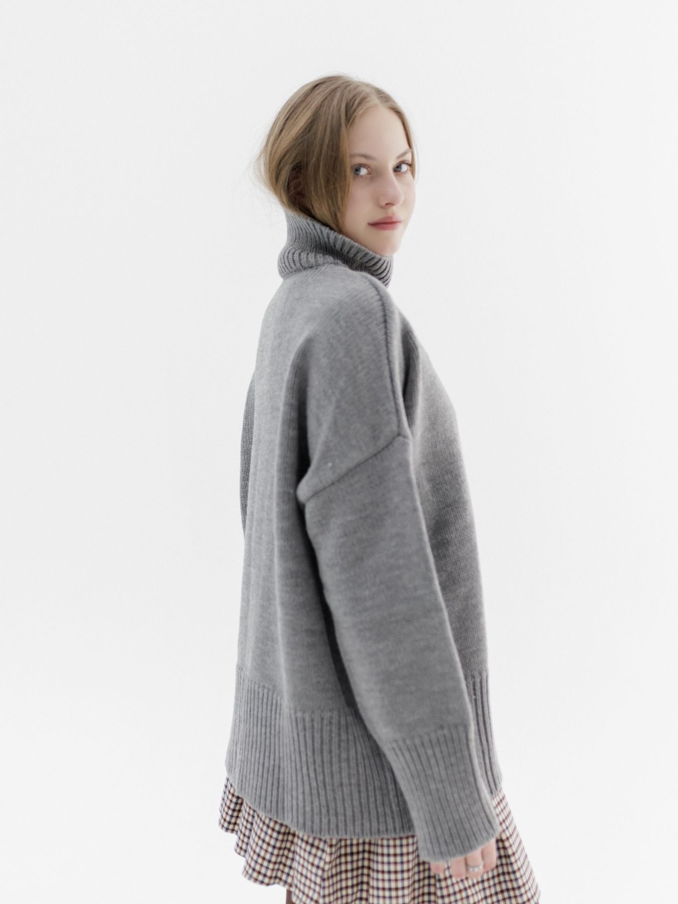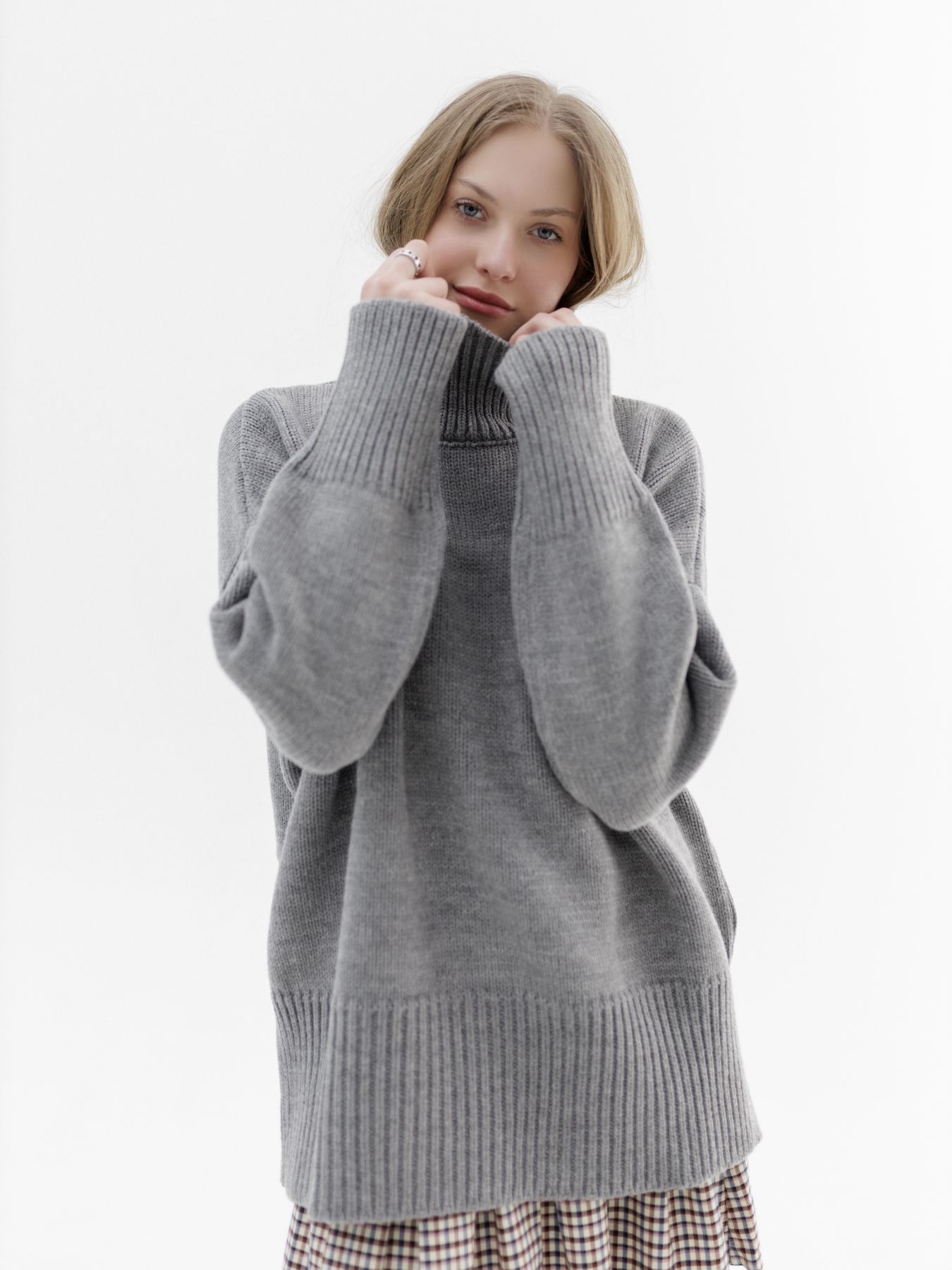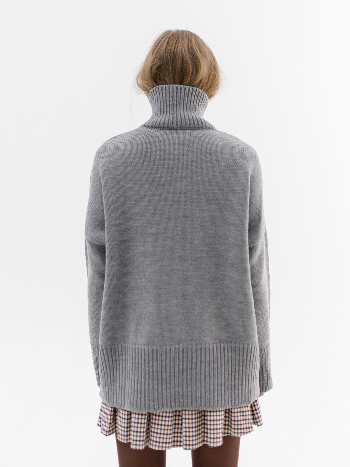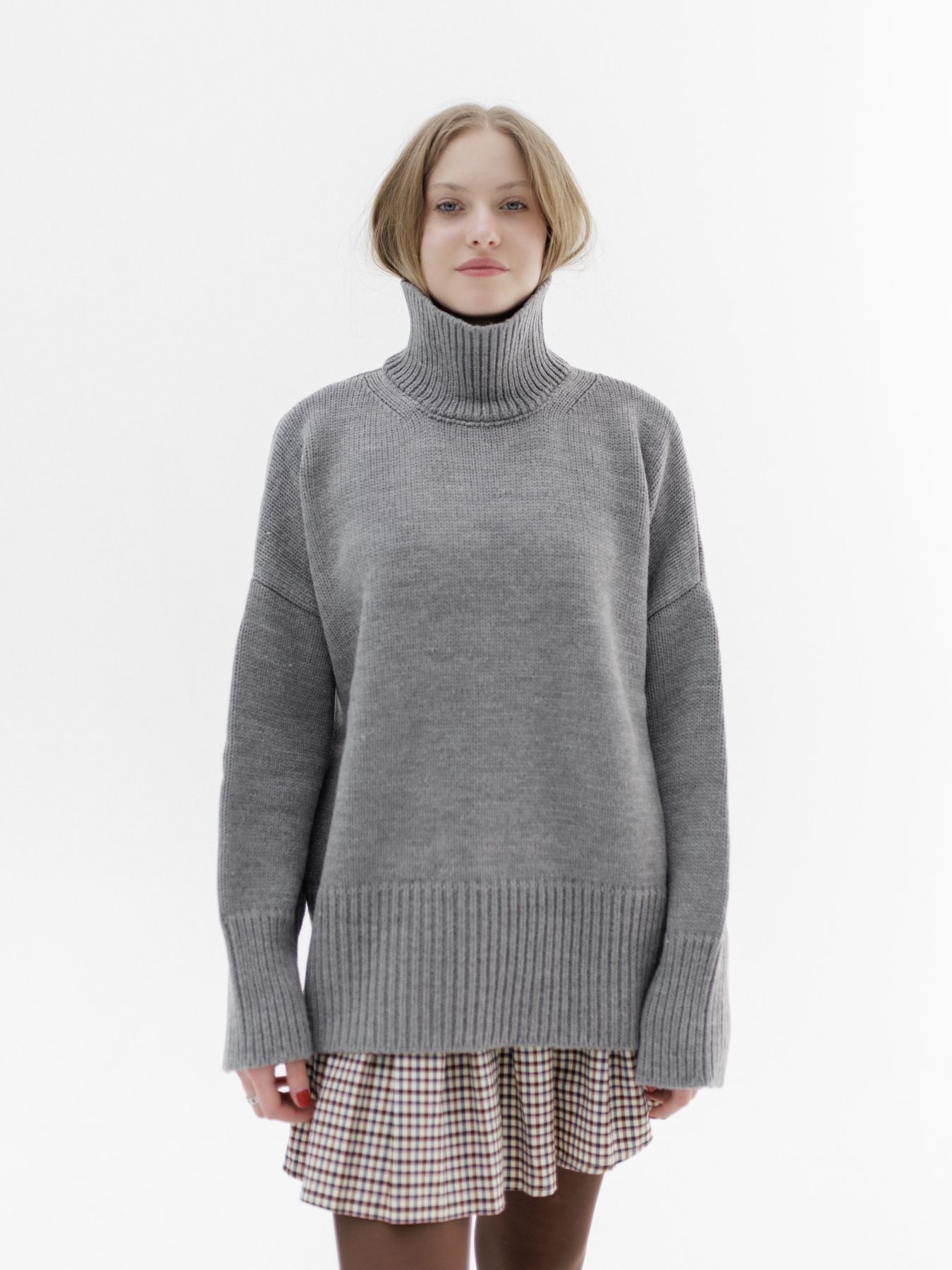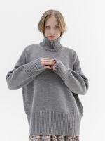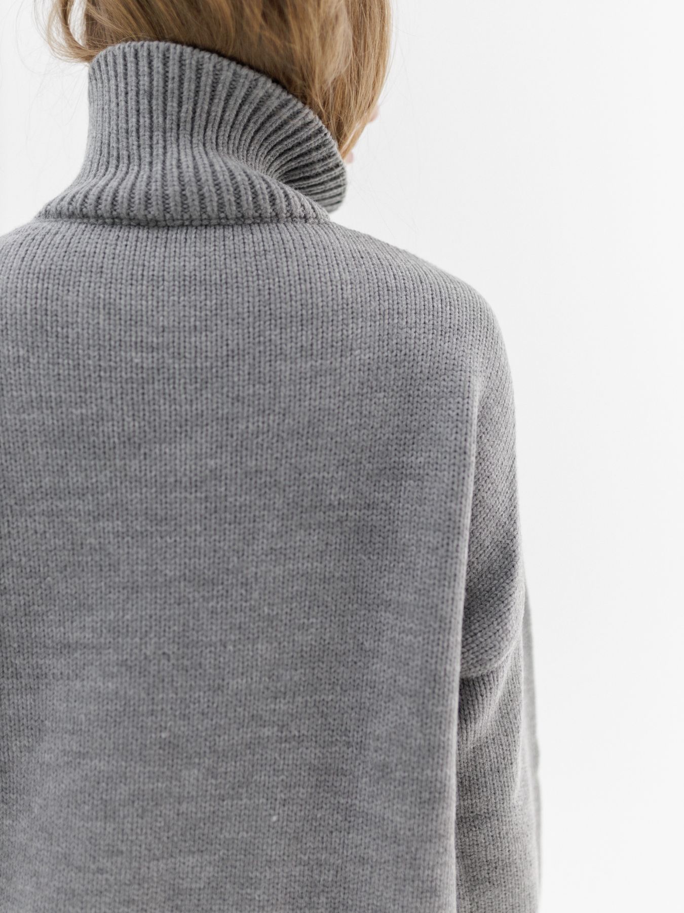 Шерстяной свитер однотонный серого цвета оверсайз кроя с широкой стойкой.