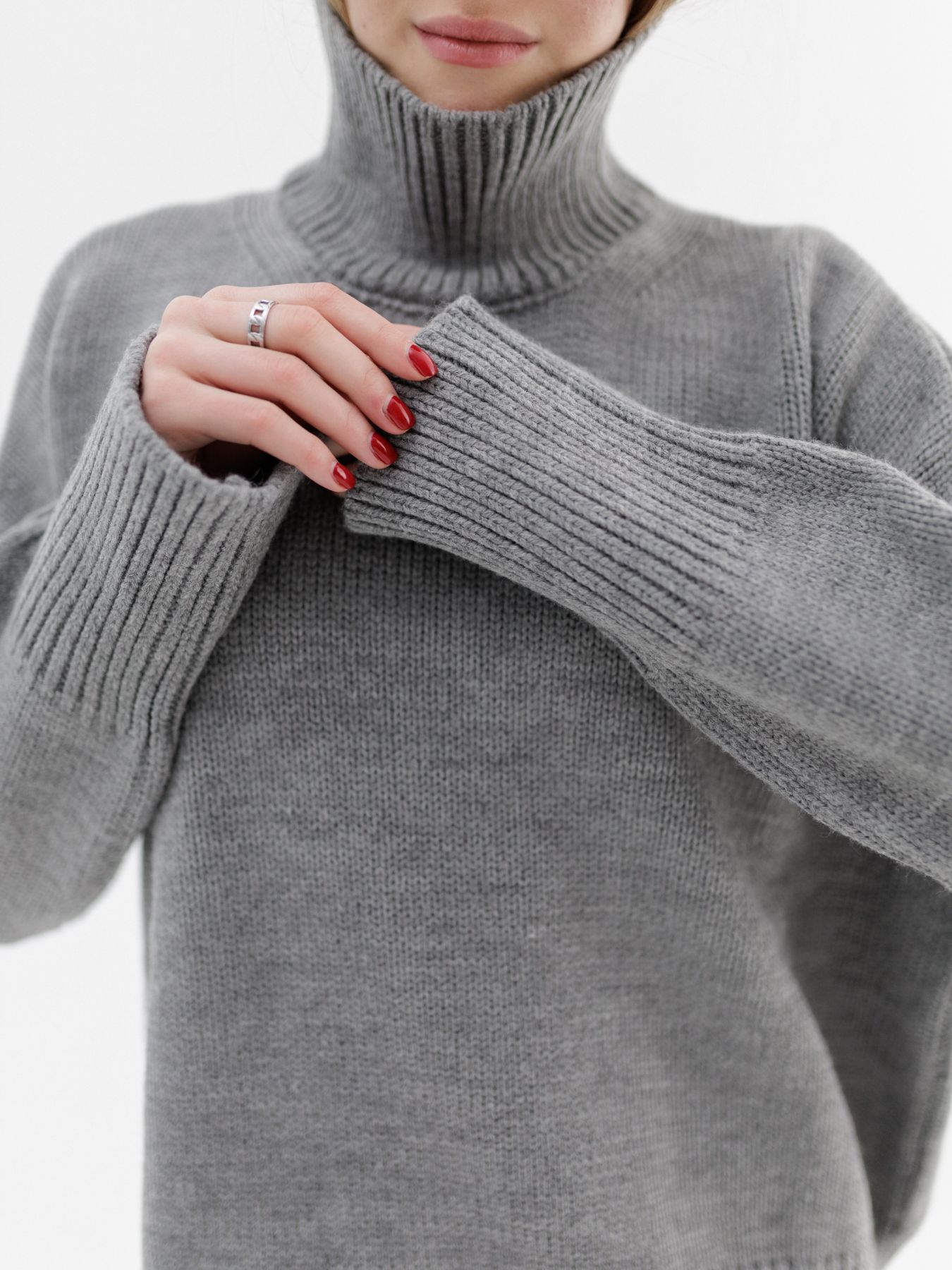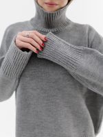 Шерстяной свитер однотонный серого цвета оверсайз кроя с широкой стойкой.