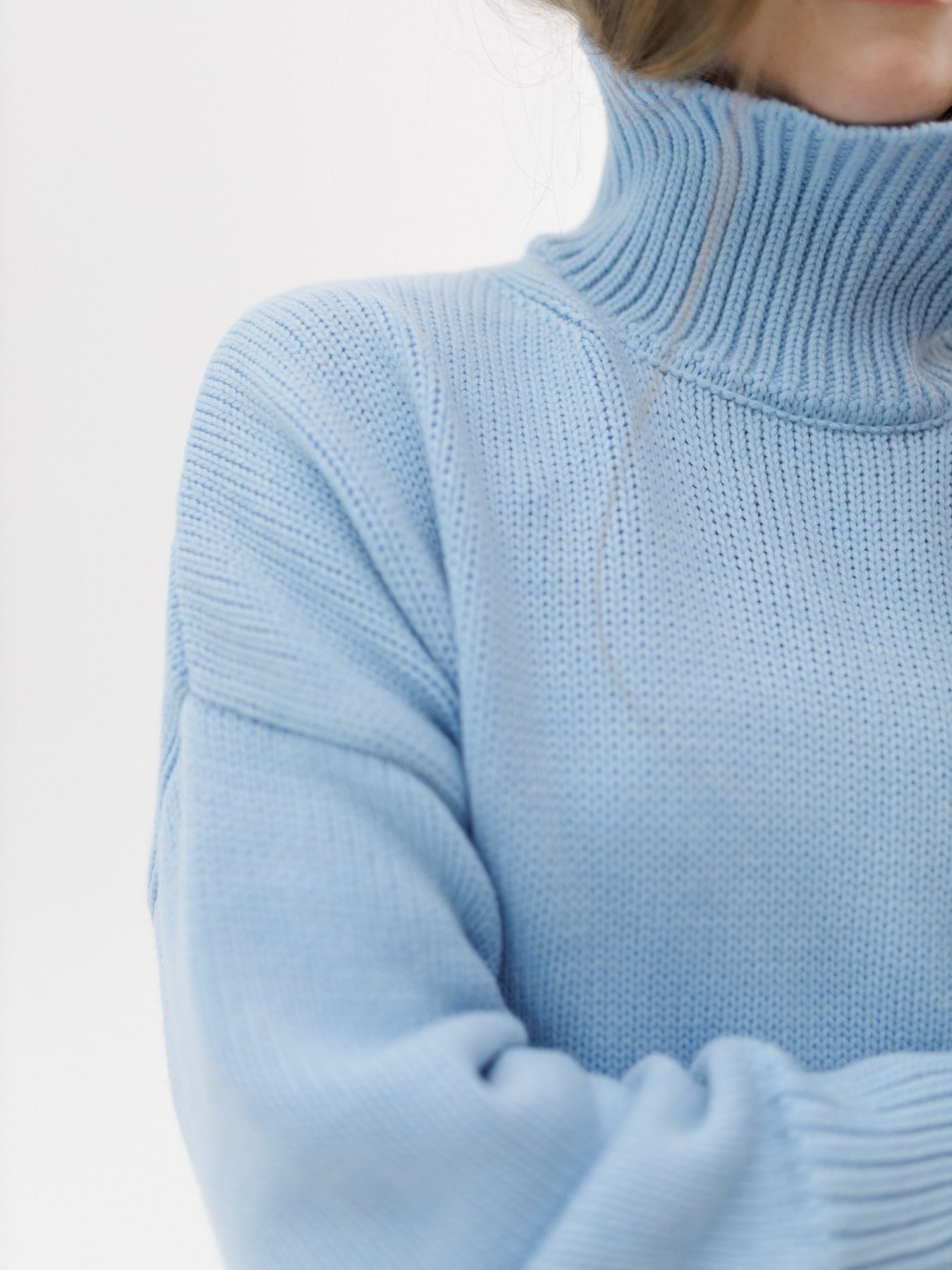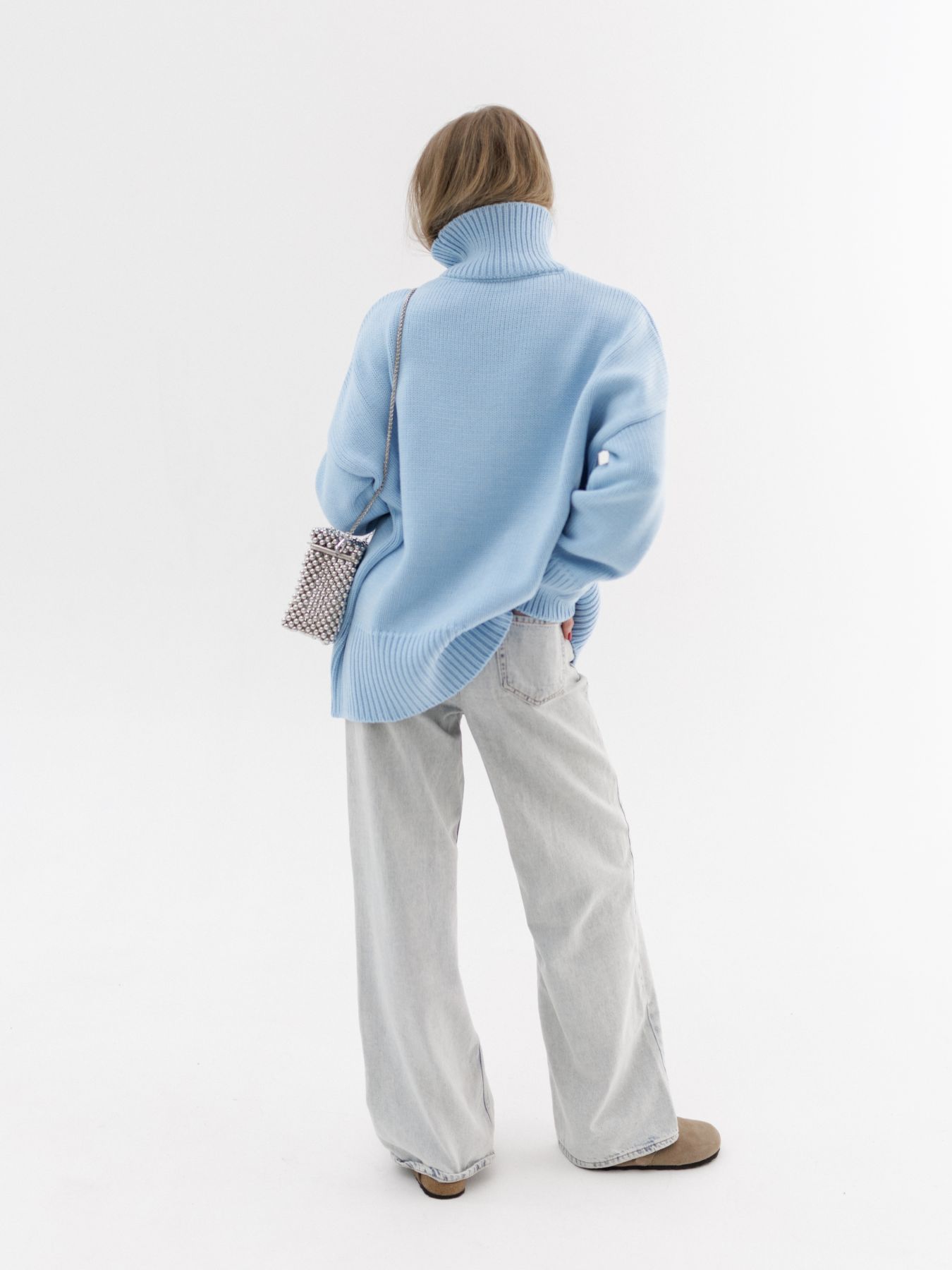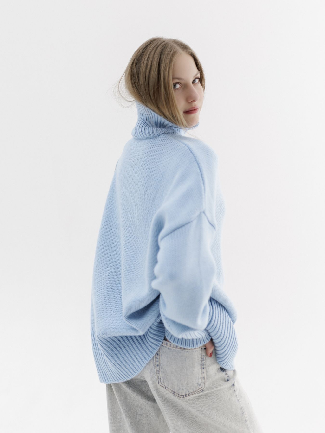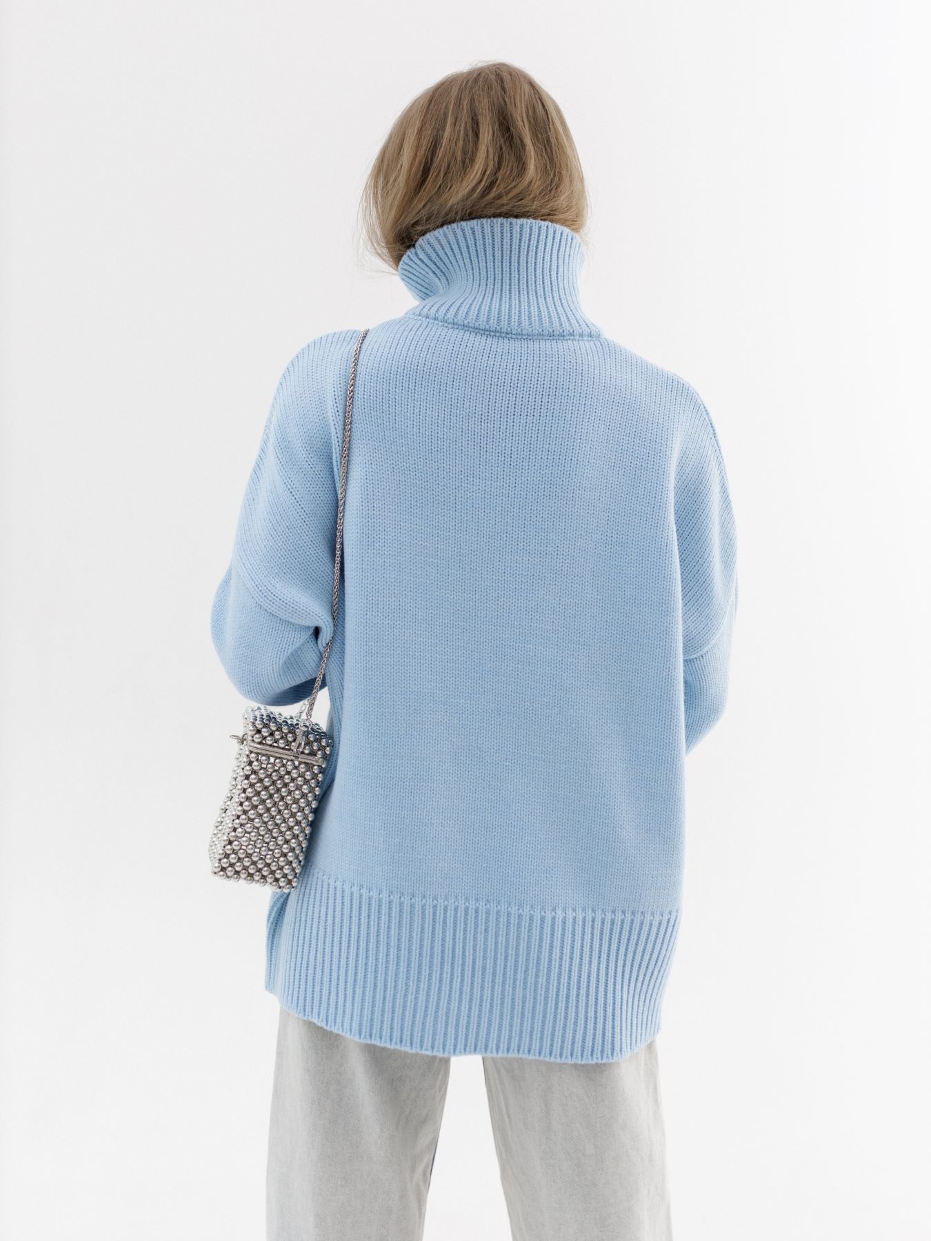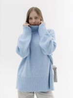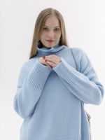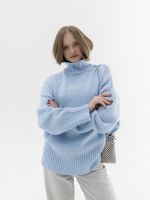 Шерстяной свитер однотонный голубого цвета оверсайз кроя с широкой стойкой.