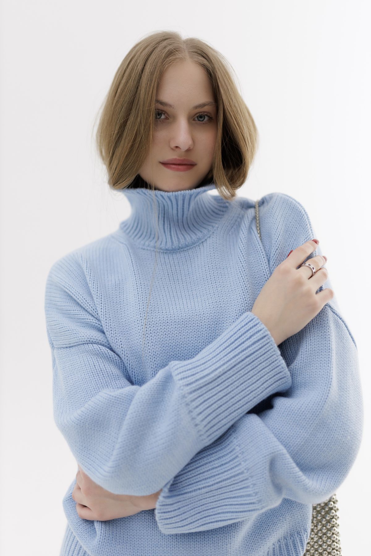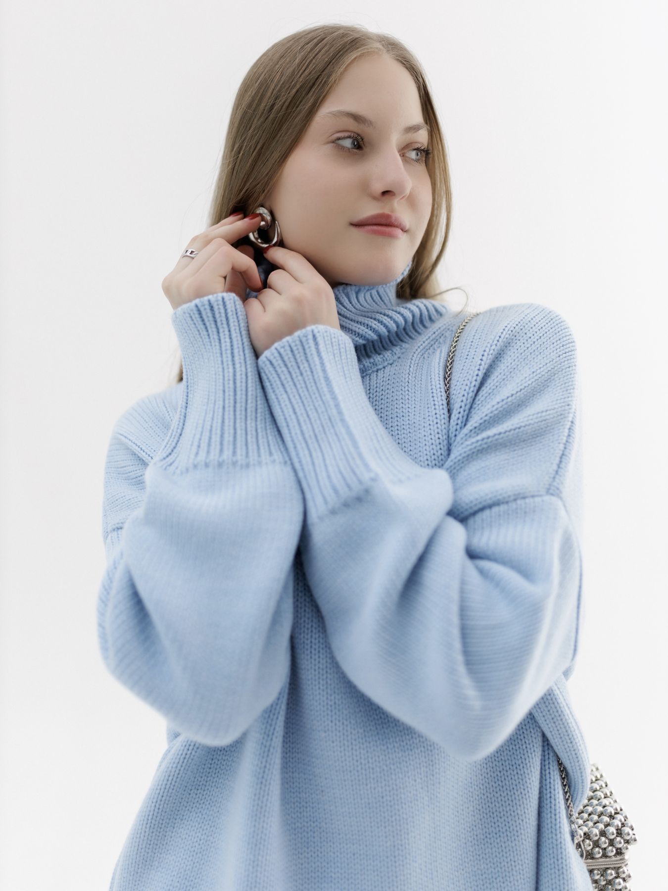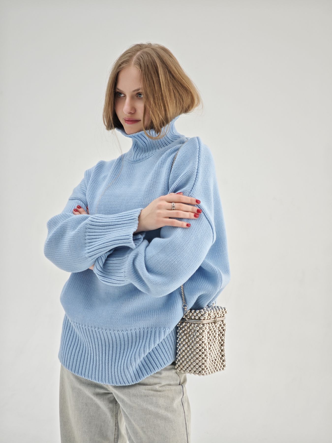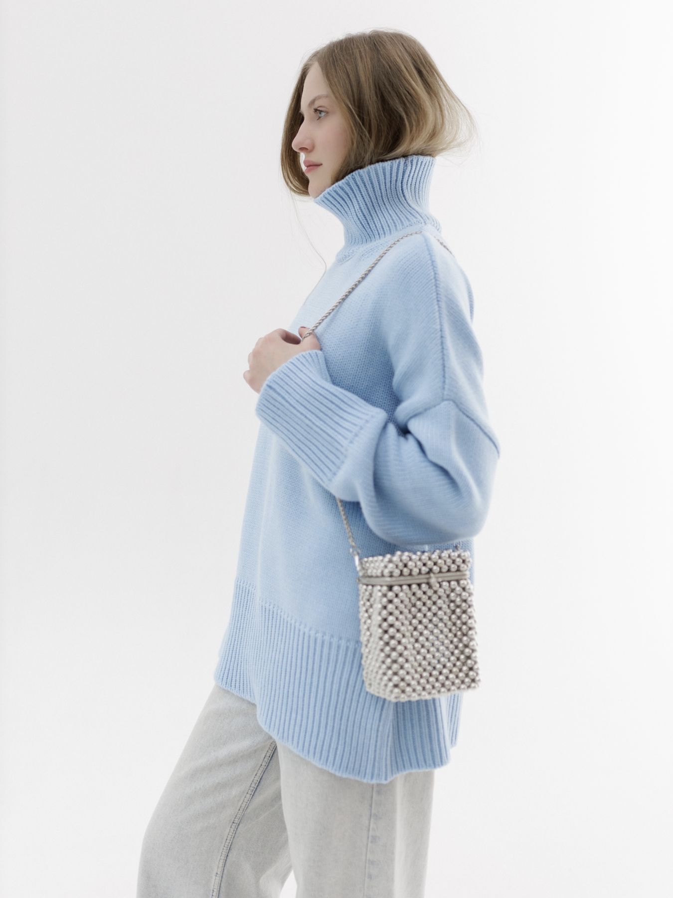 Шерстяной свитер однотонный голубого цвета оверсайз кроя с широкой стойкой.