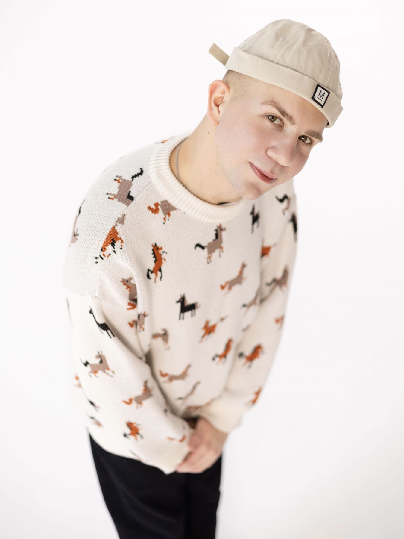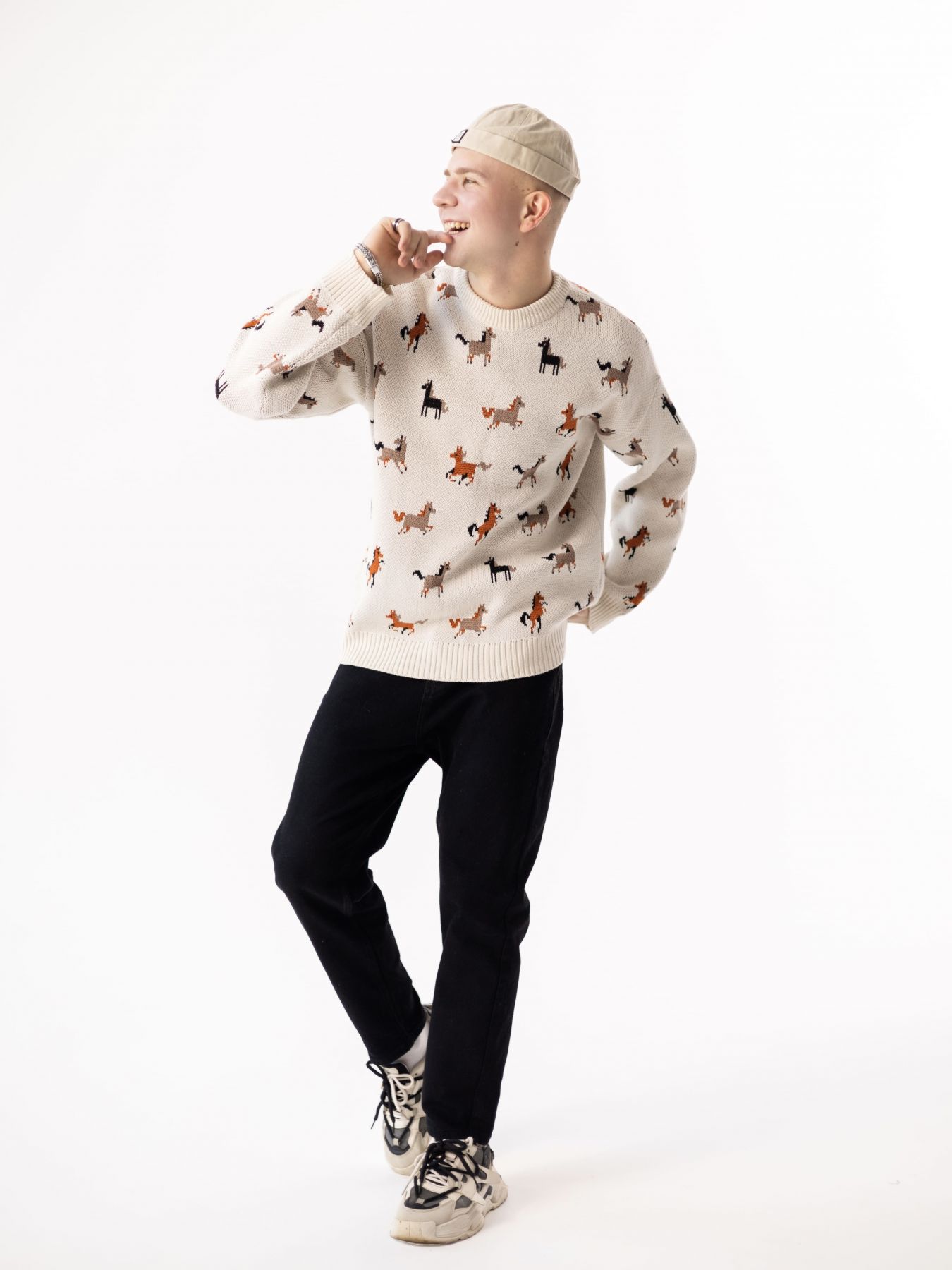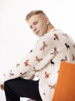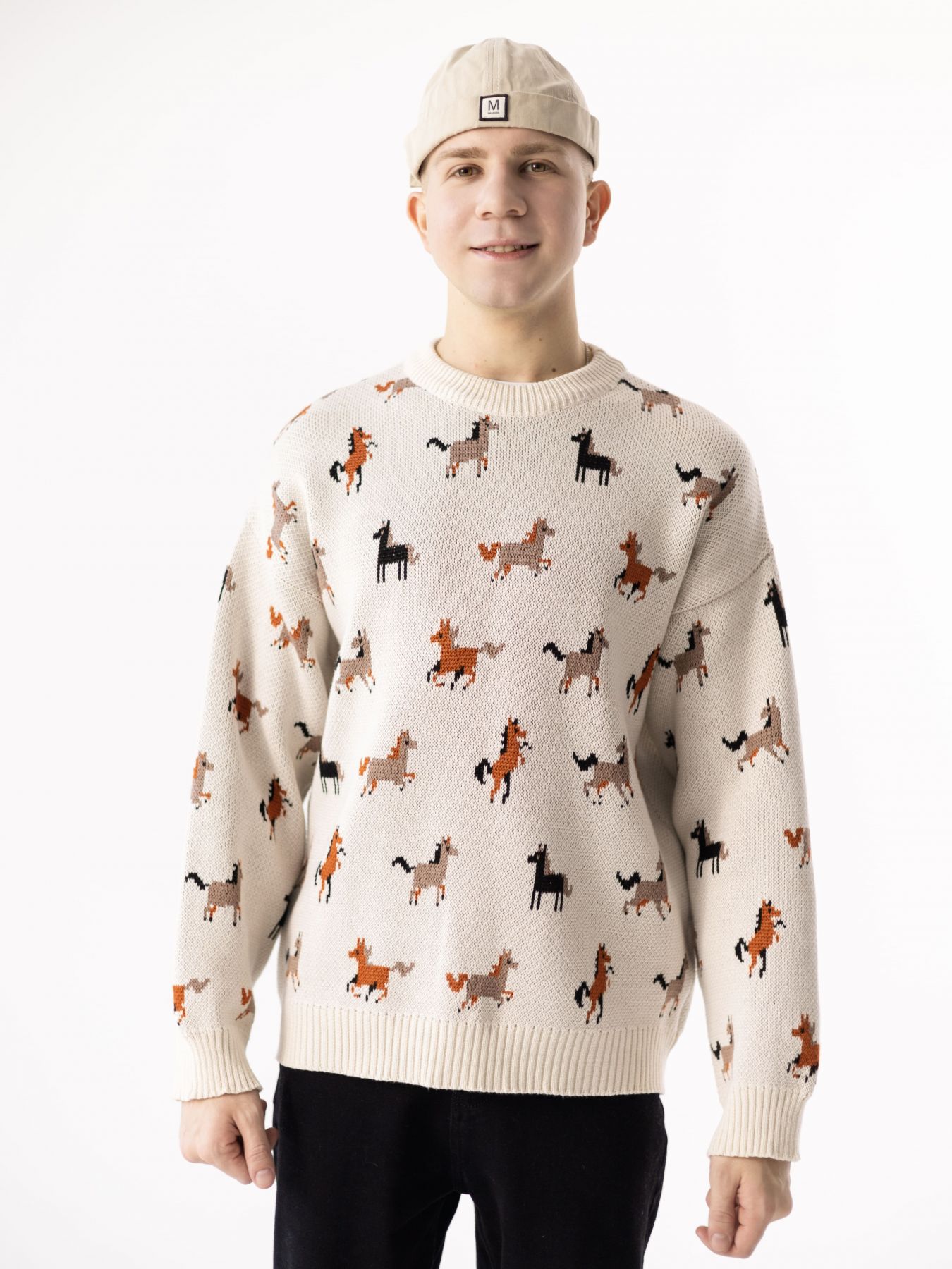 Свитер с авторским принтом - разные лошадки на бежевом фоне