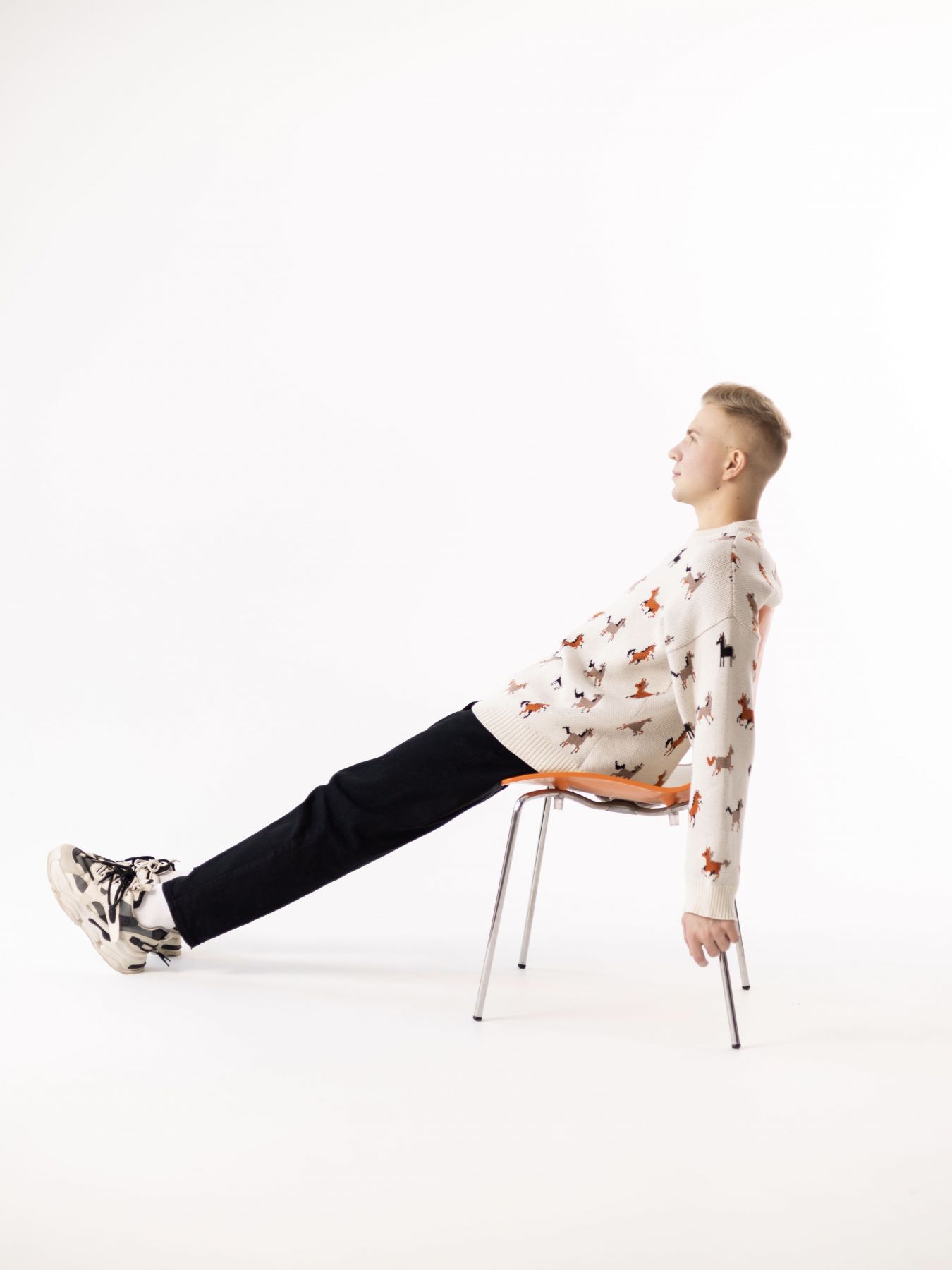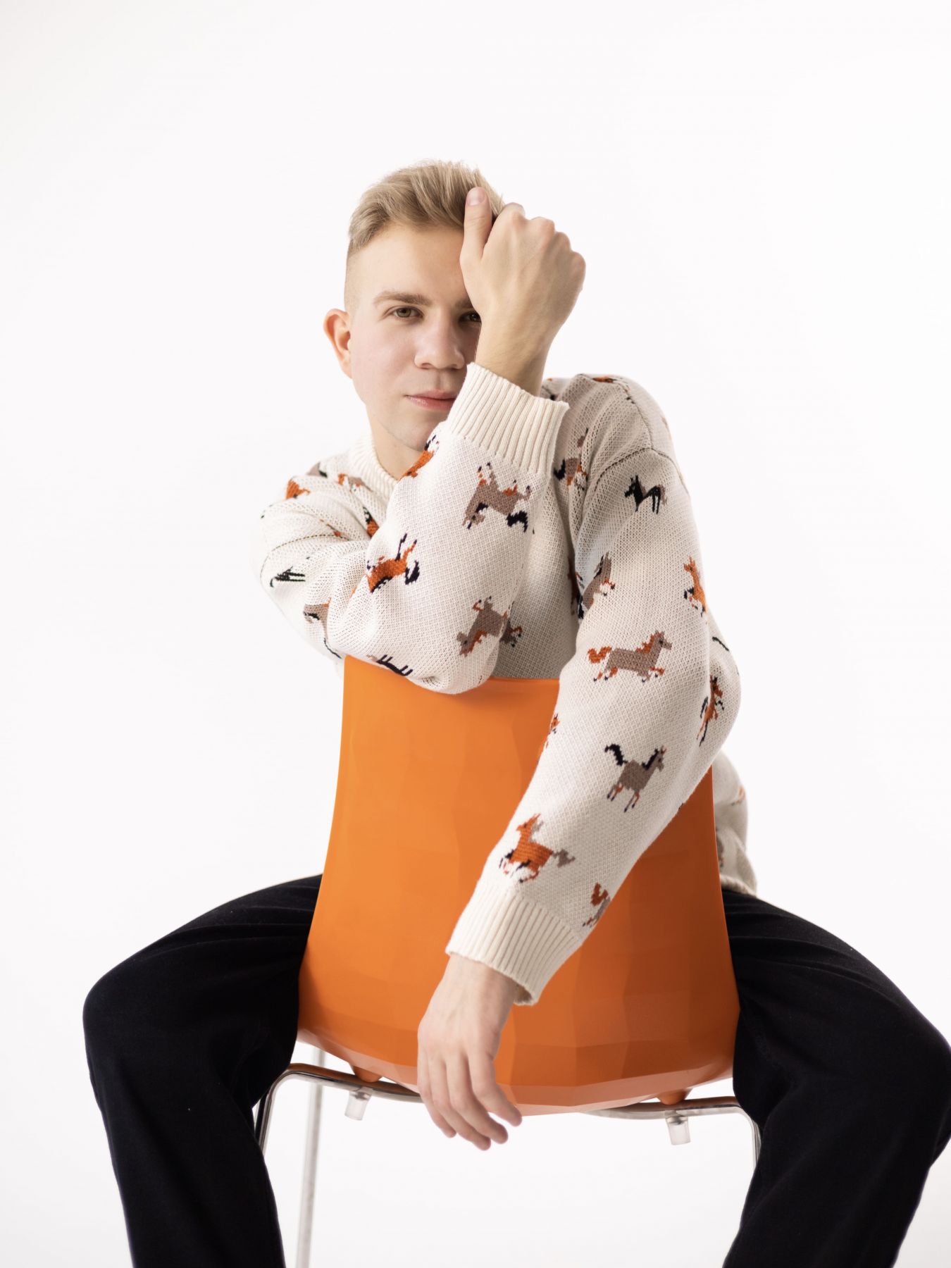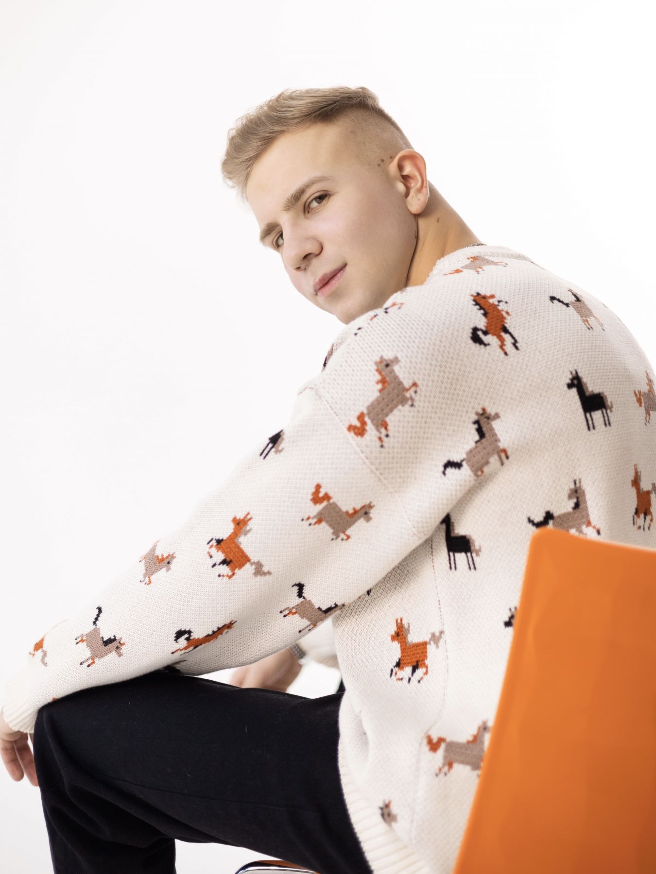 Свитер с авторским принтом - разные лошадки на бежевом фоне
