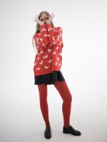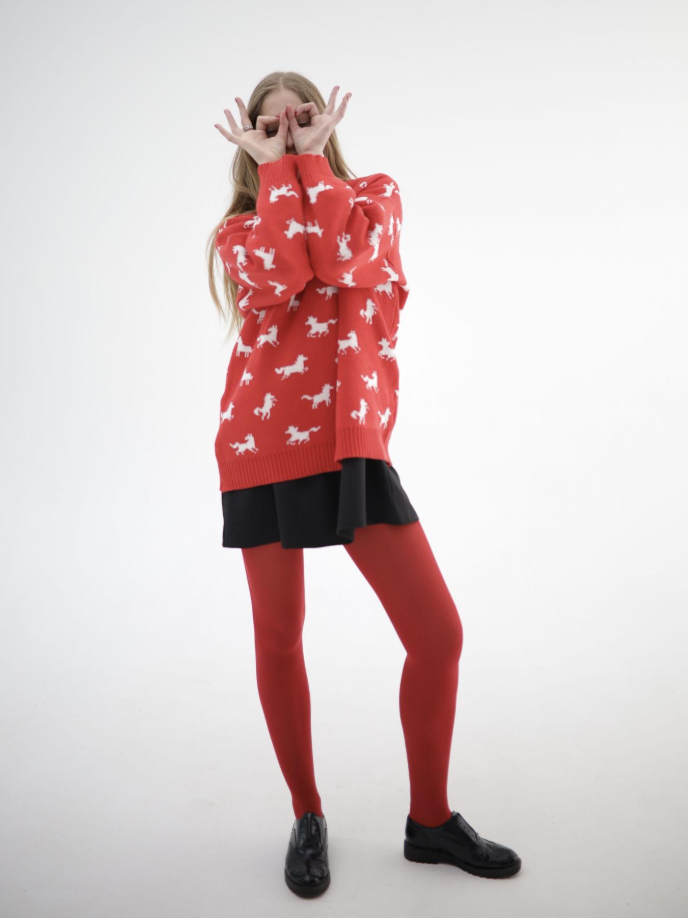 Свитер с авторским принтом - белые лошадки на красном фоне