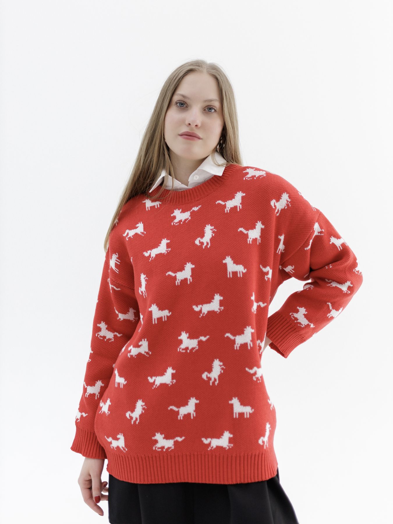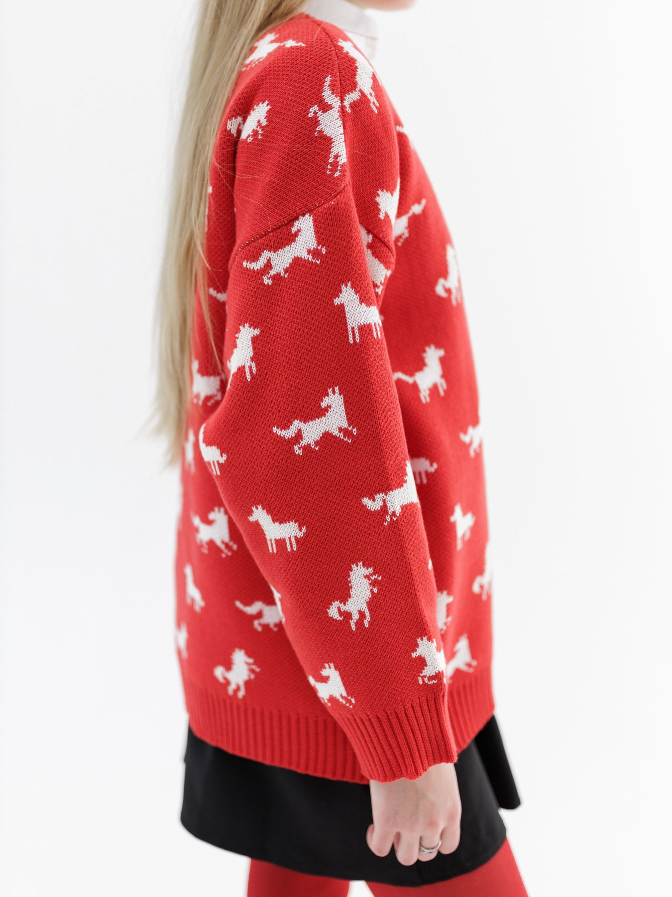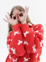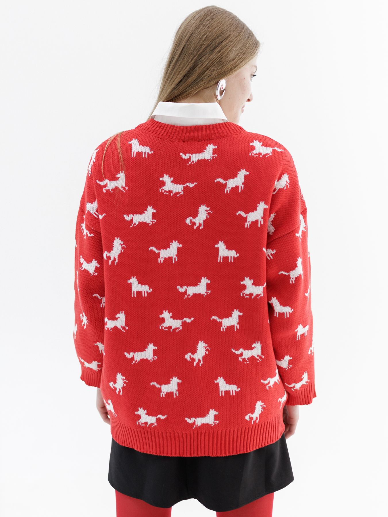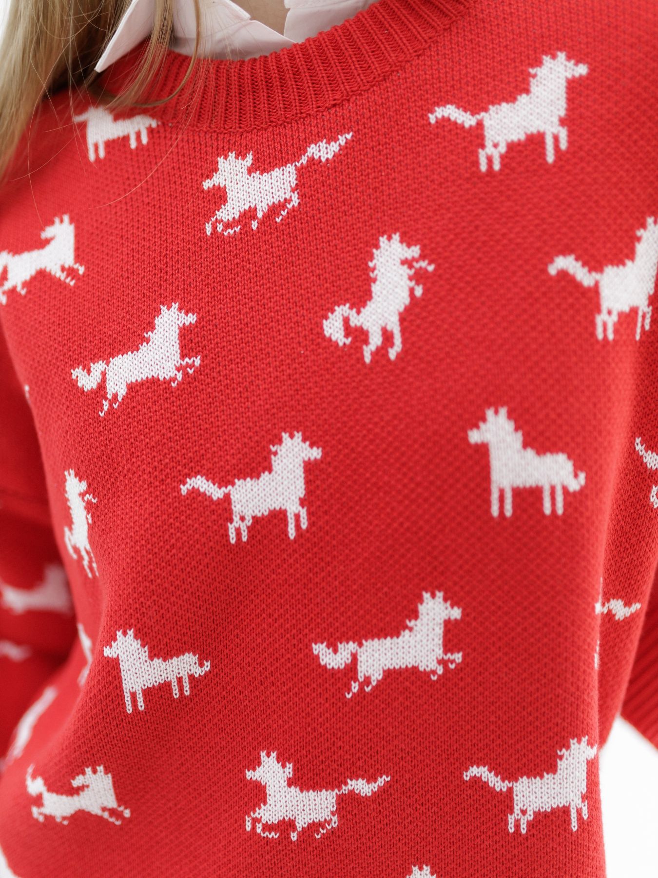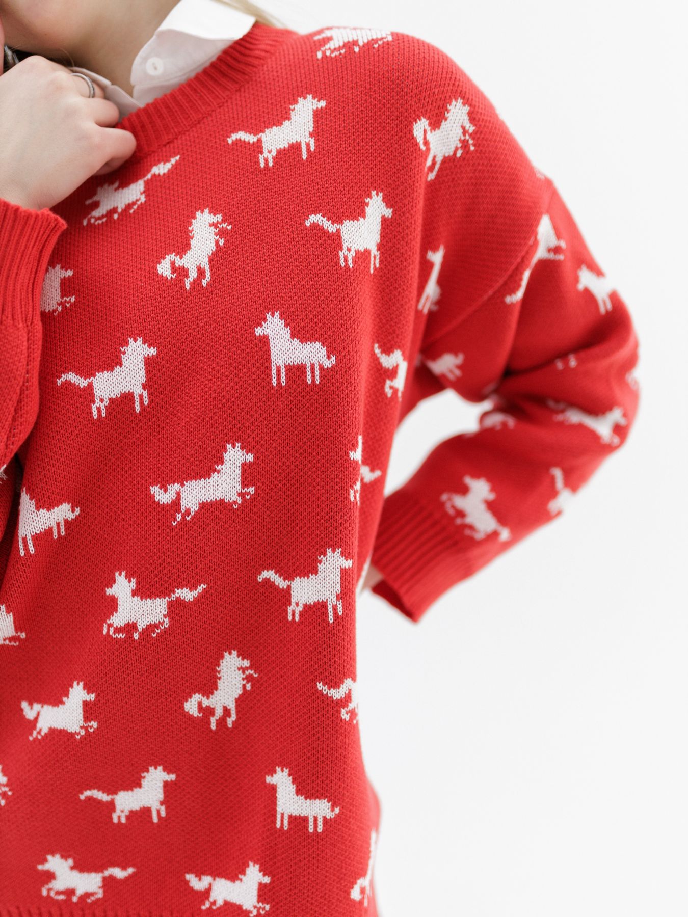 Свитер с авторским принтом - белые лошадки на красном фоне