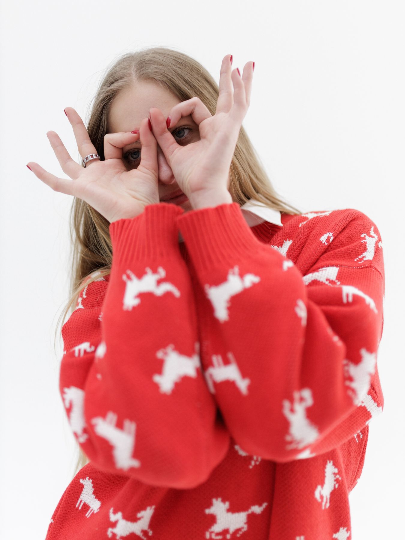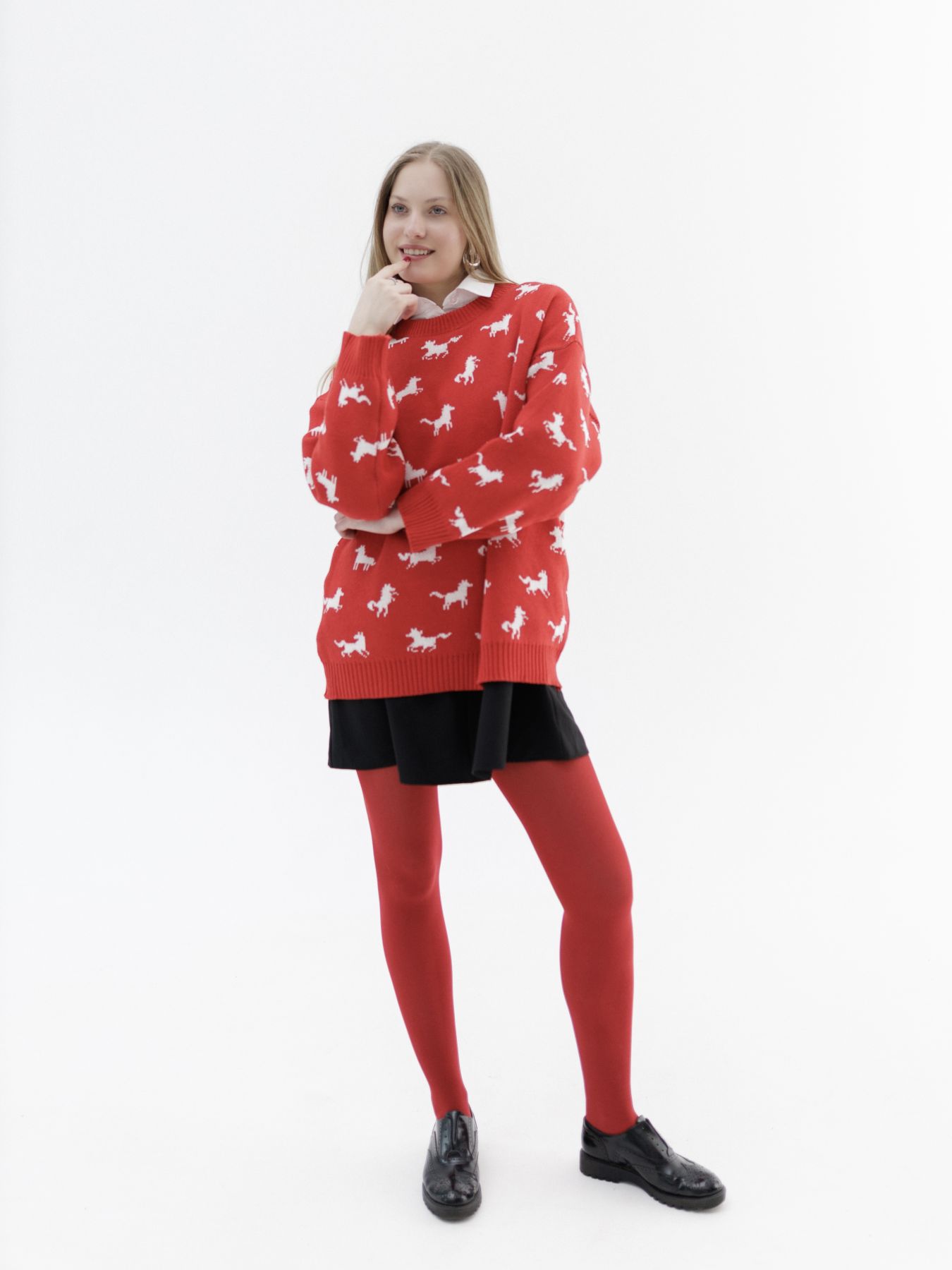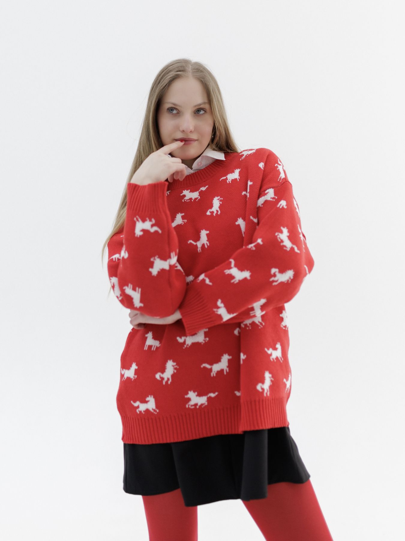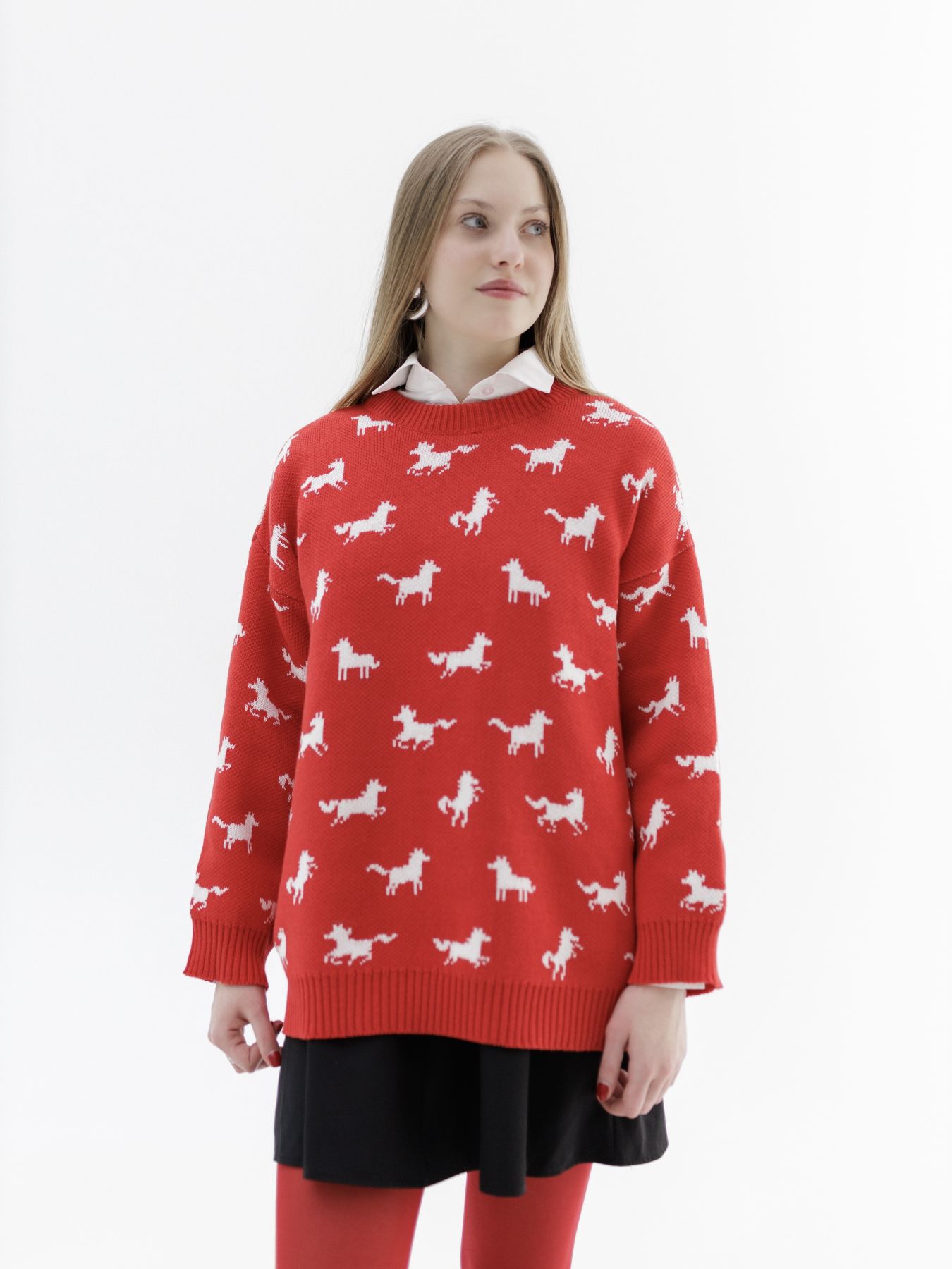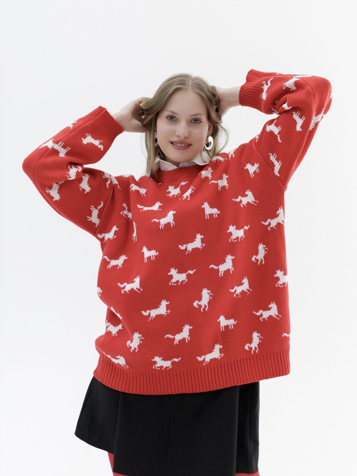 Свитер с авторским принтом - белые лошадки на красном фоне