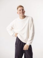 Кофта оверсайз из мягкого плотного футера 3х нитки с эффектом велюра, манжеты и низ отделаны кашкорсе, шов закрыт киперной лентой. Свитшот свободный базовый, нежого молочного цвета.