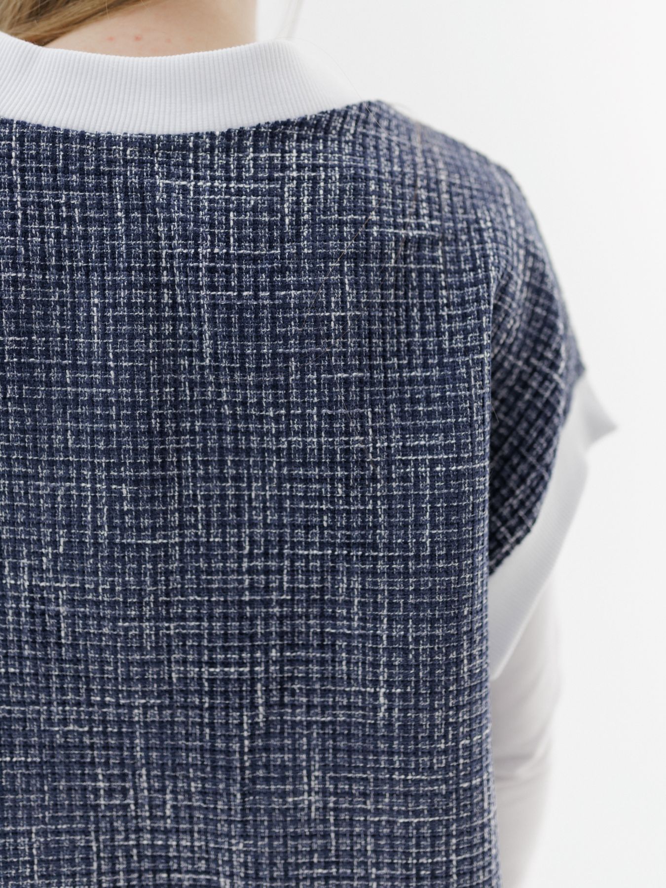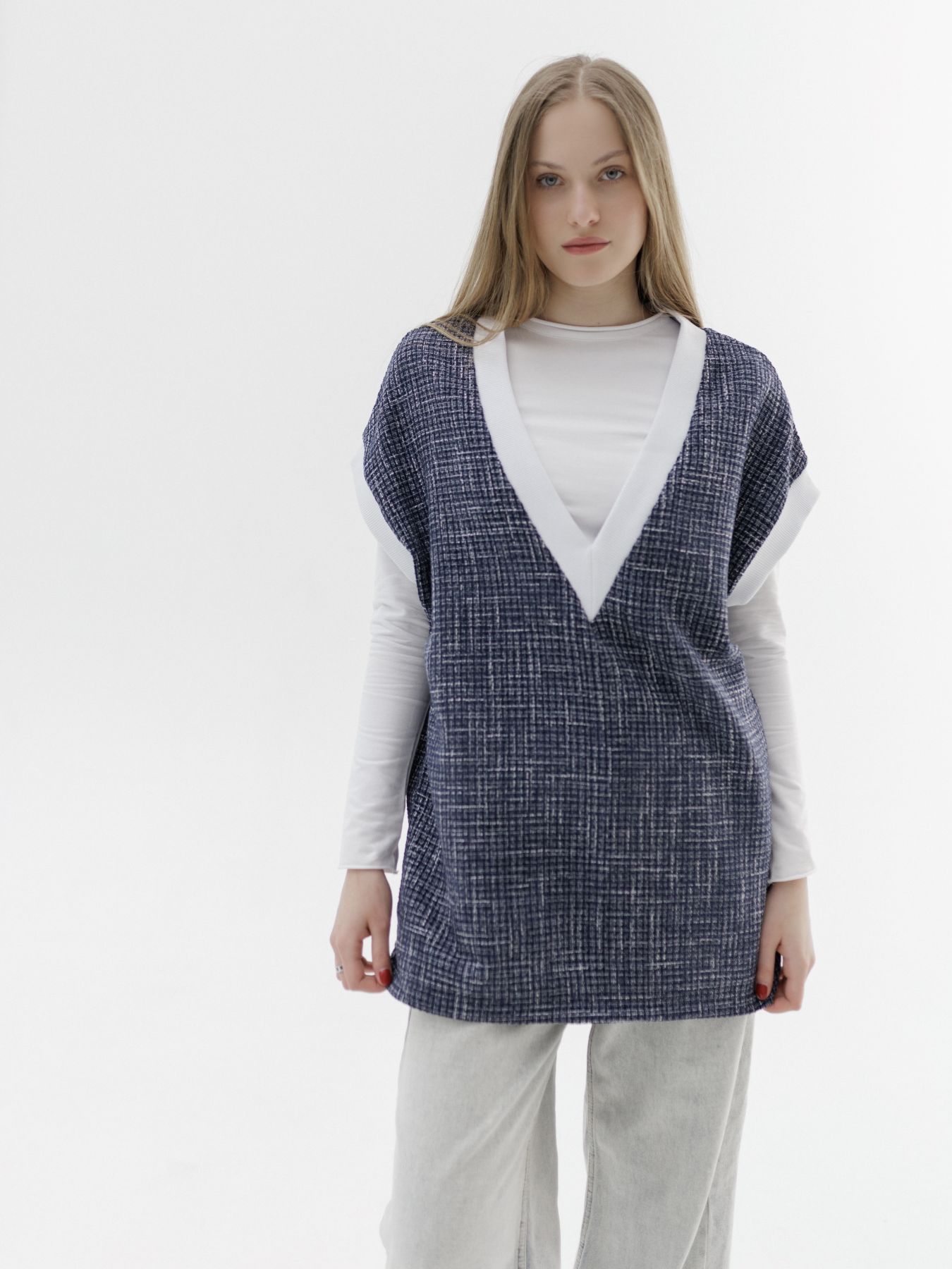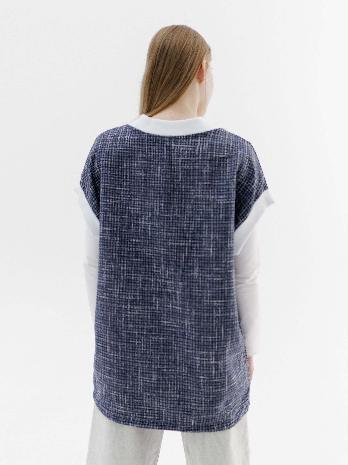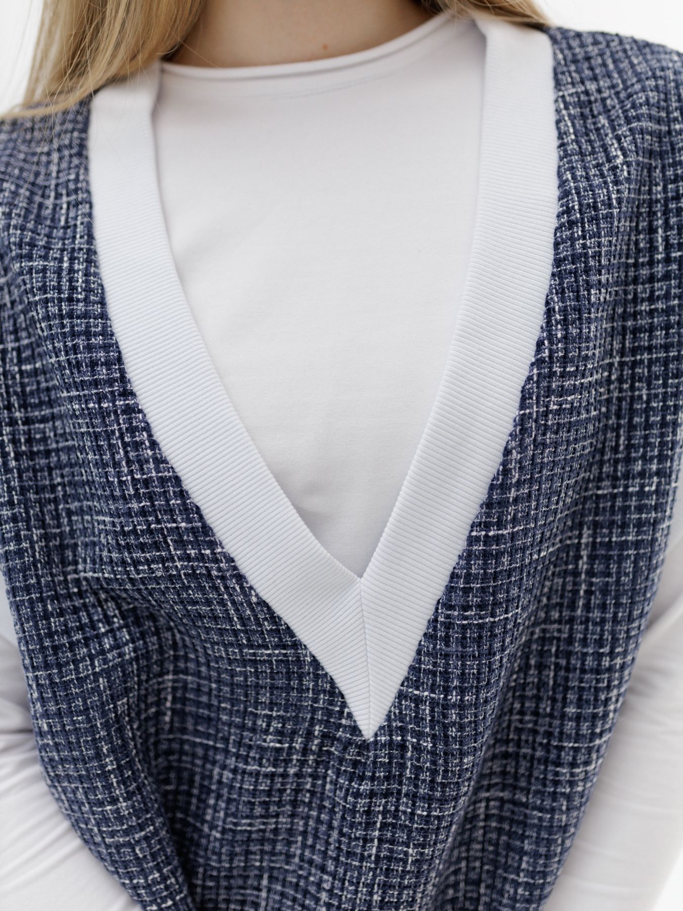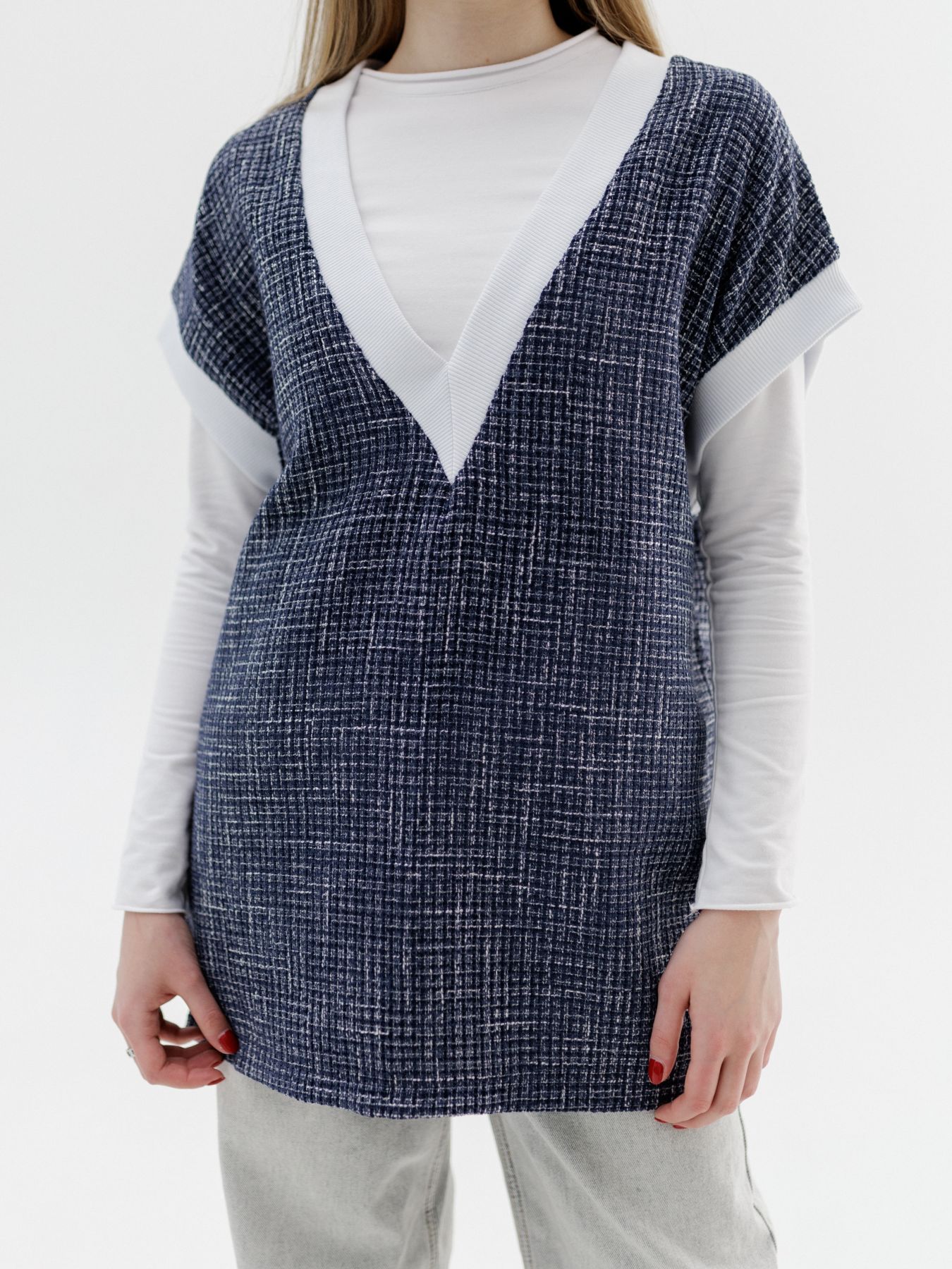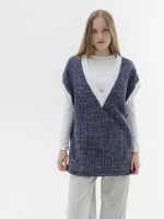 Жилет из итальянского твида - мягкий, комфортный, с красивым плетением в синем цвете.